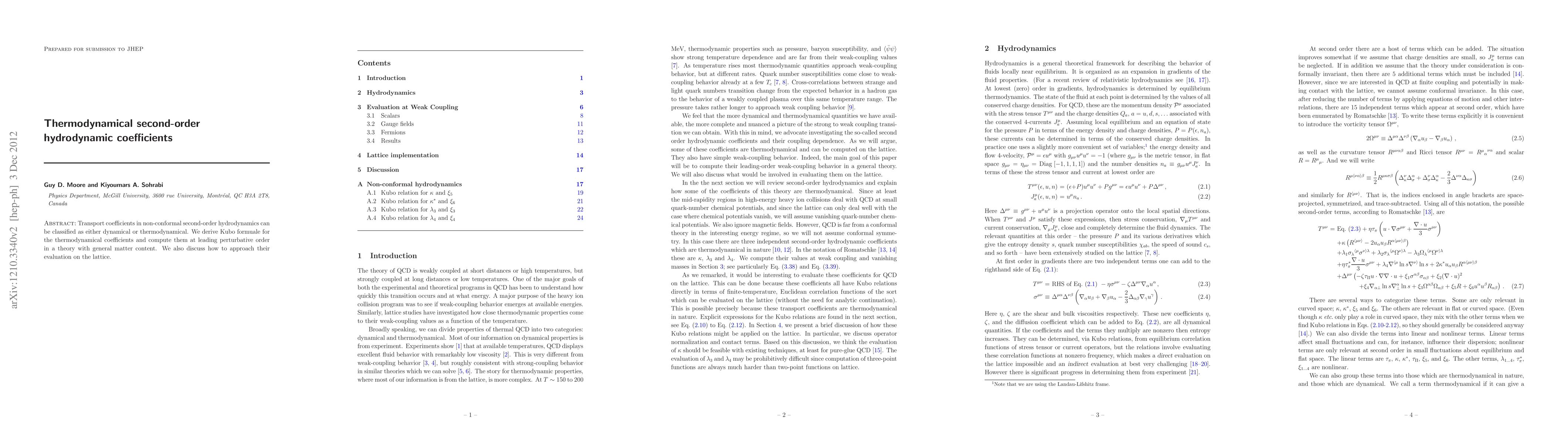 This paper derives Kubo formulas for thermodynamical second-order hydrodynamic coefficients and computes them at leading perturbative order in a theory with general matter content. It also explores methods for evaluating these coefficients on a lattice.