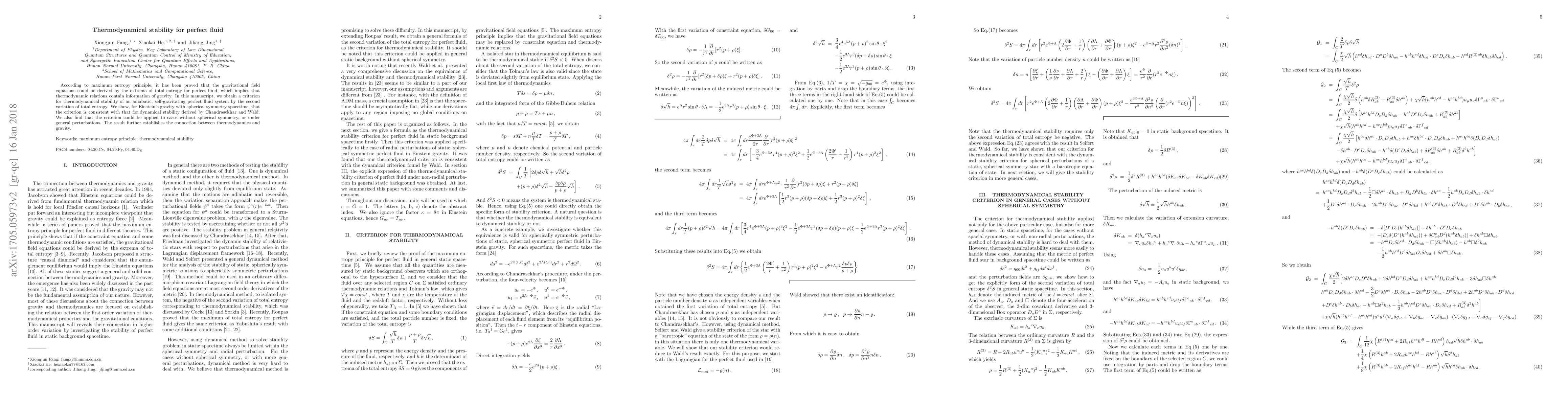 According to maximum entropy principle, it has been proved that the gravitational field equations could be derived by the extrema of total entropy for perfect fluid, which implies that thermodynamic relations contain information of gravity. In this manuscript, we obtain a criterion for thermodynamical stability of an adiabatic, self-gravitating perfect fluid system by the second variation of total entropy. We show, for Einstein's gravity with spherical symmetry spacetime, that the criterion is consistent with that for dynamical stability derived by Chandrasekhar and Wald. We also find that the criterion could be applied to cases without spherical symmetry, or under general perturbations. The result further establishes the connection between thermodynamics and gravity.