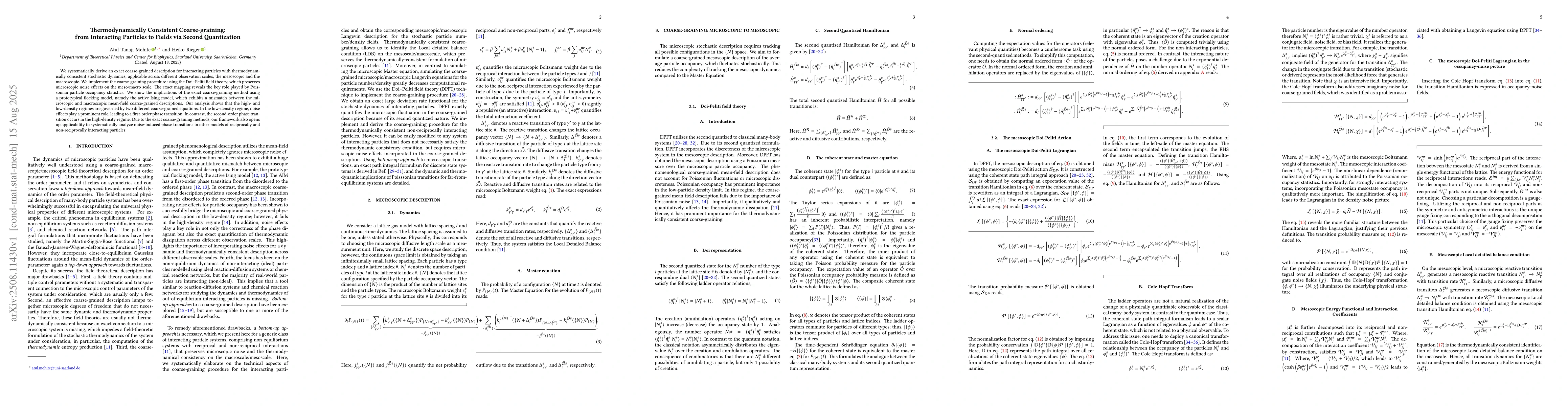 We systematically derive an exact coarse-grained description for interacting particles with thermodynamically consistent stochastic dynamics, applicable across different observation scales, the mesoscopic and the macroscopic. We implement the coarse-graining procedure using the Doi-Peliti field theory, which preserves microscopic noise effects on the meso/macro scale. The exact mapping reveals the key role played by Poissonian particle occupancy statistics. We show the implications of the exact coarse-graining method using a prototypical flocking model, namely the active Ising model, which exhibits a mismatch between the microscopic and macroscopic mean-field coarse-grained descriptions. Our analysis shows that the high- and low-density regimes are governed by two different coarse-grained equations. In the low-density regime, noise effects play a prominent role, leading to a first-order phase transition. In contrast, the second-order phase transition occurs in the high-density regime. Due to the exact coarse-graining methods, our framework also opens up applicability to systematically analyze noise-induced phase transitions in other models of reciprocally and non-reciprocally interacting particles.