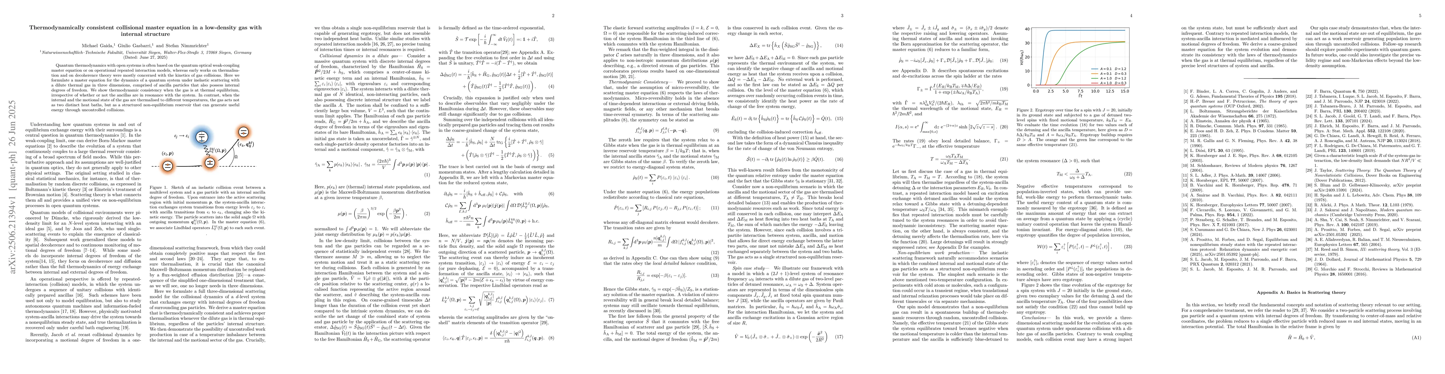 The paper develops a thermodynamically consistent quantum master equation for a low-density gas with internal structure, derived from scattering theory and traced out motional and internal degrees of freedom of gas particles.