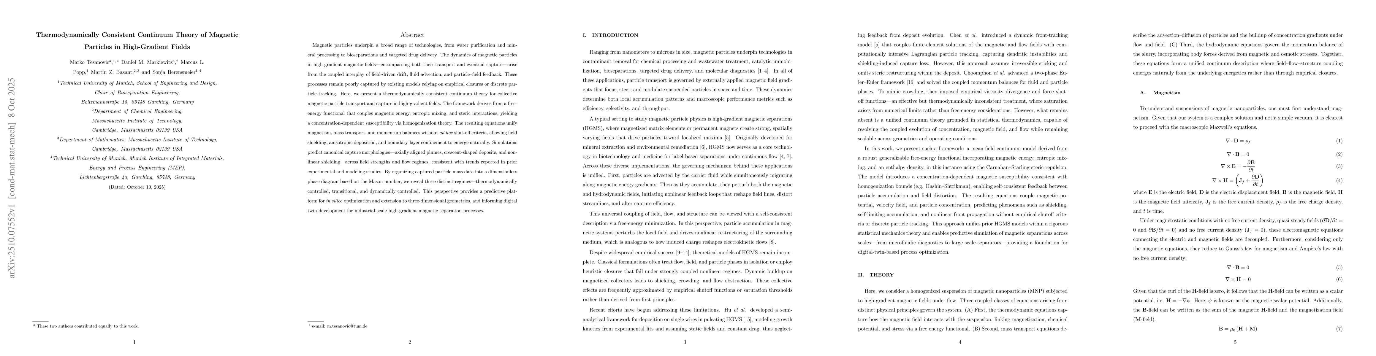 The study develops a thermodynamically consistent continuum theory coupling magnetic energy, entropic mixing, and steric interactions through a free-energy functional. It integrates magnetism, mass transport, and momentum balances using homogenization theory to model magnetic particle transport and capture in high-gradient fields.
