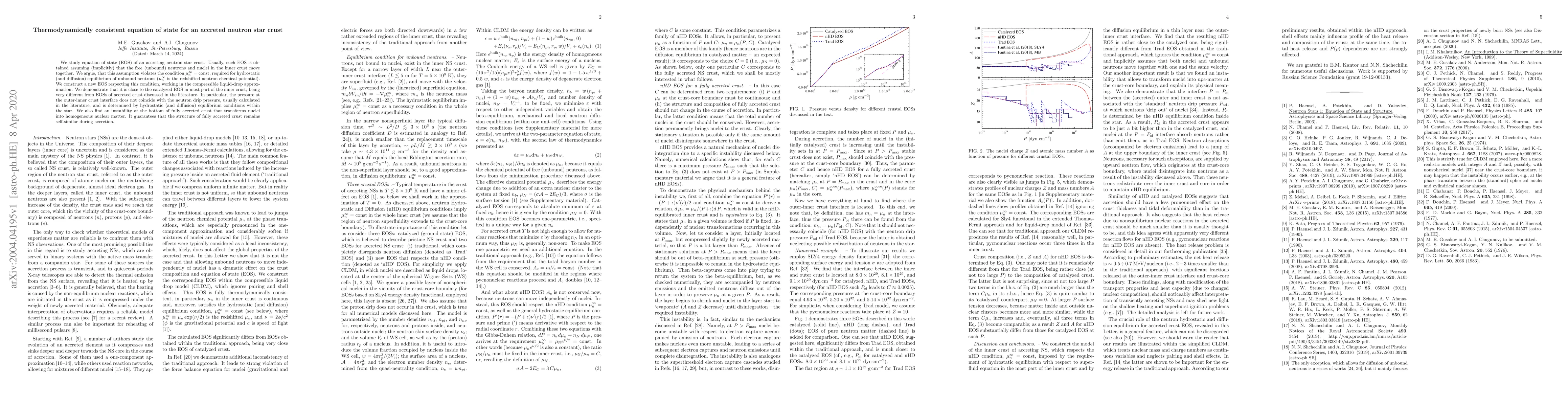 We study equation of state (EOS) of an accreting neutron star crust. Usually, such EOS is obtained assuming (implicitly) that the free (unbound) neutrons and nuclei in the inner crust move together. We argue, that this assumption violates the condition $\mu_n^\infty={\rm const}$, required for hydrostatic (and diffusion) equilibrium of unbound neutrons ($\mu^\infty_n$ is the redshifted neutron chemical potential). We construct a new EOS respecting this condition, working in the compressible liquid-drop approximation. We demonstrate that it is close to the catalyzed EOS in most part of the inner crust, being very different from EOSs of accreted crust discussed in the literature. In particular, the pressure at the outer-inner crust interface does not coincide with the neutron drip pressure, usually calculated in the literature, and is determined by hydrostatic (and diffusion) equilibrium conditions within the star. We also find an instability at the bottom of fully accreted crust that transforms nuclei into homogeneous nuclear matter. It guarantees that the structure of fully accreted crust remains self-similar during accretion.