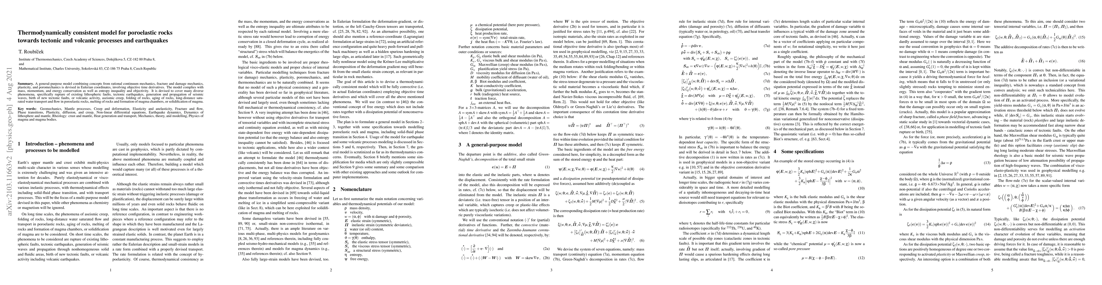 This paper presents a thermodynamically consistent model for poroelastic rocks that integrates continuum mechanics, fracture and damage mechanics, plasticity, and poromechanics. The model aims to accurately simulate a wide range of tectonic and volcanic processes, including earthquakes, fault rupture, seismic wave propagation, and magma formation.