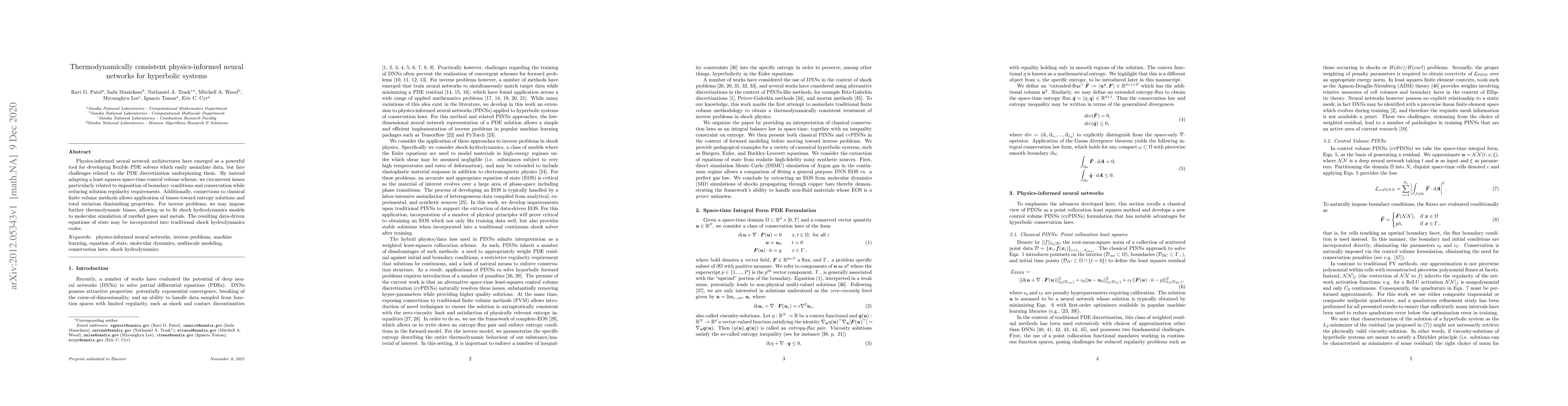 Physics-informed neural network architectures have emerged as a powerful tool for developing flexible PDE solvers which easily assimilate data, but face challenges related to the PDE discretization underpinning them. By instead adapting a least squares space-time control volume scheme, we circumvent issues particularly related to imposition of boundary conditions and conservation while reducing solution regularity requirements. Additionally, connections to classical finite volume methods allows application of biases toward entropy solutions and total variation diminishing properties. For inverse problems, we may impose further thermodynamic biases, allowing us to fit shock hydrodynamics models to molecular simulation of rarefied gases and metals. The resulting data-driven equations of state may be incorporated into traditional shock hydrodynamics codes.