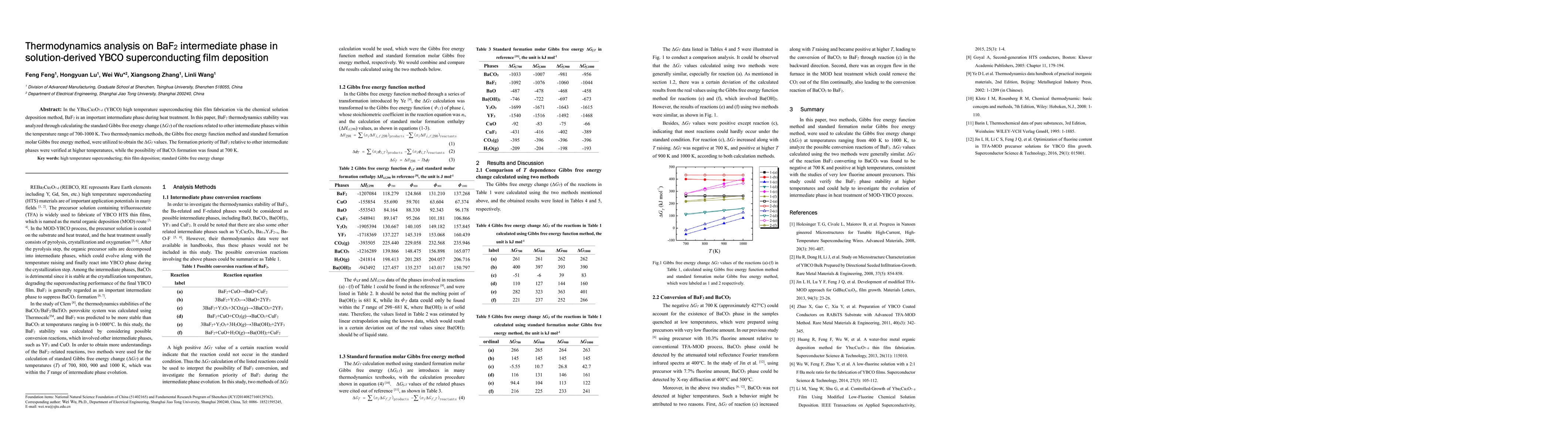 In the YBa2Cu3O7-{\delta} (YBCO) high temperature superconducting thin film fabrication via the chemical solution deposition method, BaF2 is an important intermediate phase during heat treatment. In this paper, BaF2 thermodynamics stability was analyzed through calculating the standard Gibbs free energy change ({\Delta}GT) of the reactions related to other intermediate phases within the temperature range of 700-1000 K. Two thermodynamics methods, the Gibbs free energy function method and standard formation molar Gibbs free energy method, were utilized to obtain the {\Delta}GT values. The formation priority of BaF2 relative to other intermediate phases were verified at higher temperatures, while the possibility of BaCO3 formation was found at 700 K.