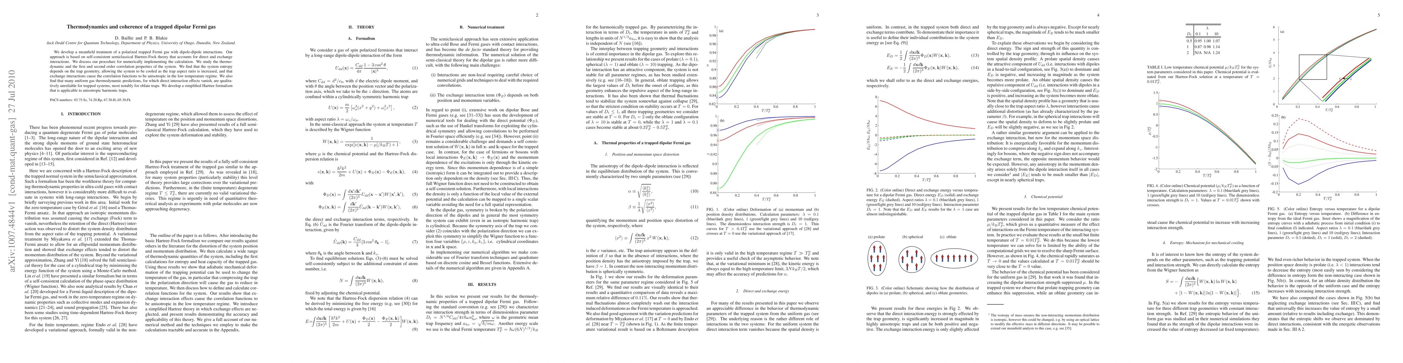 We develop a meanfield treatment of a polarized trapped Fermi gas with dipole-dipole interactions. Our approach is based on self-consistent semiclassical Hartree-Fock theory that accounts for direct and exchange interactions. We discuss our procedure for numerically implementing the calculation. We study the thermodynamic and the first and second order correlation properties of the system. We find that the system entropy depends on the trap geometry, allowing the system to be cooled as the trap aspect ratio is increased, and that exchange interactions cause the correlation functions to be anisotropic in the low temperature regime. We also find that many uniform gas thermodynamic predictions, for which direct interaction effects vanish, are qualitatively unreliable for trapped systems, most notably for oblate traps. We develop a simplified Hartree formalism that is applicable to anisotropic harmonic traps.