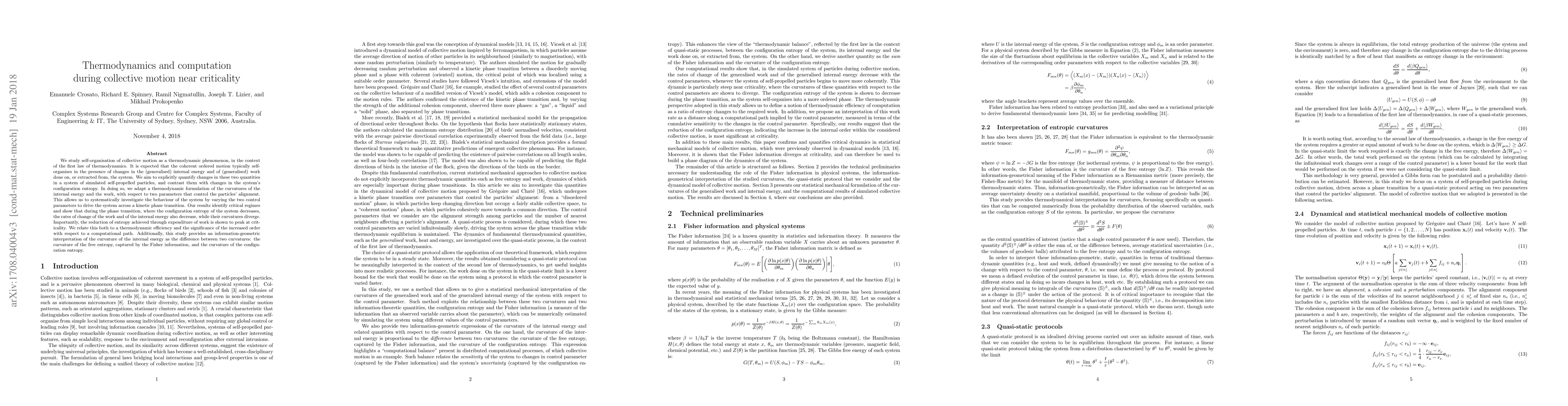 We study self-organisation of collective motion as a thermodynamic phenomenon, in the context of the first law of thermodynamics. It is expected that the coherent ordered motion typically self-organises in the presence of changes in the (generalised) internal energy and of (generalised) work done on, or extracted from, the system. We aim to explicitly quantify changes in these two quantities in a system of simulated self-propelled particles, and contrast them with changes in the system's configuration entropy. In doing so, we adapt a thermodynamic formulation of the curvatures of the internal energy and the work, with respect to two parameters that control the particles' alignment. This allows us to systematically investigate the behaviour of the system by varying the two control parameters to drive the system across a kinetic phase transition. Our results identify critical regimes and show that during the phase transition, where the configuration entropy of the system decreases, the rates of change of the work and of the internal energy also decrease, while their curvatures diverge. Importantly, the reduction of entropy achieved through expenditure of work is shown to peak at criticality. We relate this both to a thermodynamic efficiency and the significance of the increased order with respect to a computational path. Additionally, this study provides an information-geometric interpretation of the curvature of the internal energy as the difference between two curvatures: the curvature of the free entropy, captured by the Fisher information, and the curvature of the configuration entropy.