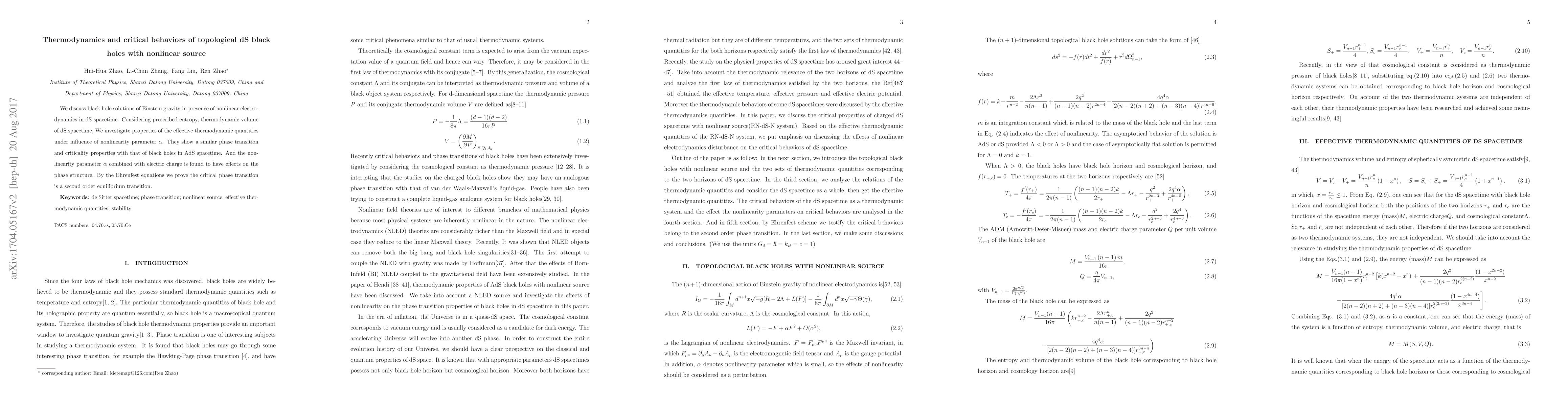We discuss black hole solutions of Einstein gravity in presence of nonlinear electrodynamics in dS spacetime. Considering prescribed entropy, thermodynamic volume of dS spacetime, We investigate properties of the effective thermodynamic quantities under influence of nonlinearity parameter $\alpha$. They show a similar phase transition and criticality properties with that of black holes in AdS spacetime. And the nonlinearity parameter $\alpha$ combined with electric charge is found to have effects on the phase structure. By the Ehrenfest equations we prove the critical phase transition is a second order equilibrium transition.