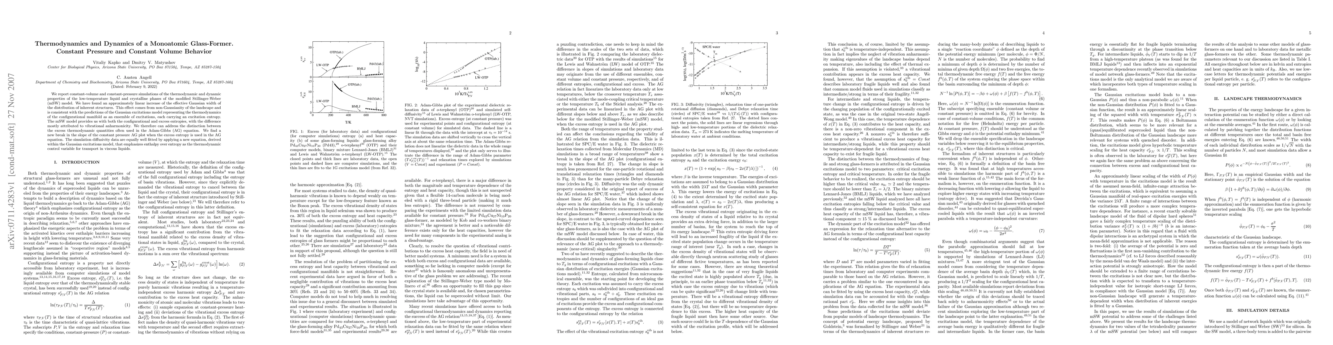 We report constant-volume and constant-pressure simulations of the thermodynamic and dynamic properties of the low-temperature liquid and crystalline phases of the modified Stillinger-Weber (mSW) model. We have found an approximately linear increase of the effective Gaussian width of the distribution of inherent structures. This effect comes from non-Gaussianity of the landscape and is consistent with the predictions of the Gaussian excitations model representing the thermodynamics of the configurational manifold as an ensemble of excitations, each carrying an excitation entropy. The mSW model provides us with both the configurational and excess entropies, with the difference mostly attributed to vibrational anharmonicity. We therefore can address the distinction between the excess thermodynamic quantities often used in the Adam-Gibbs (AG) equation. We find a new break in the slope of the constant pressure AG plot when the excess entropy is used in the AG equation. The simulation diffusivity data are equally well fitted by applying a new equation, derived within the Gaussian excitations model, that emphasizes enthalpy over entropy as the thermodynamic control variable for transport in viscous liquids.