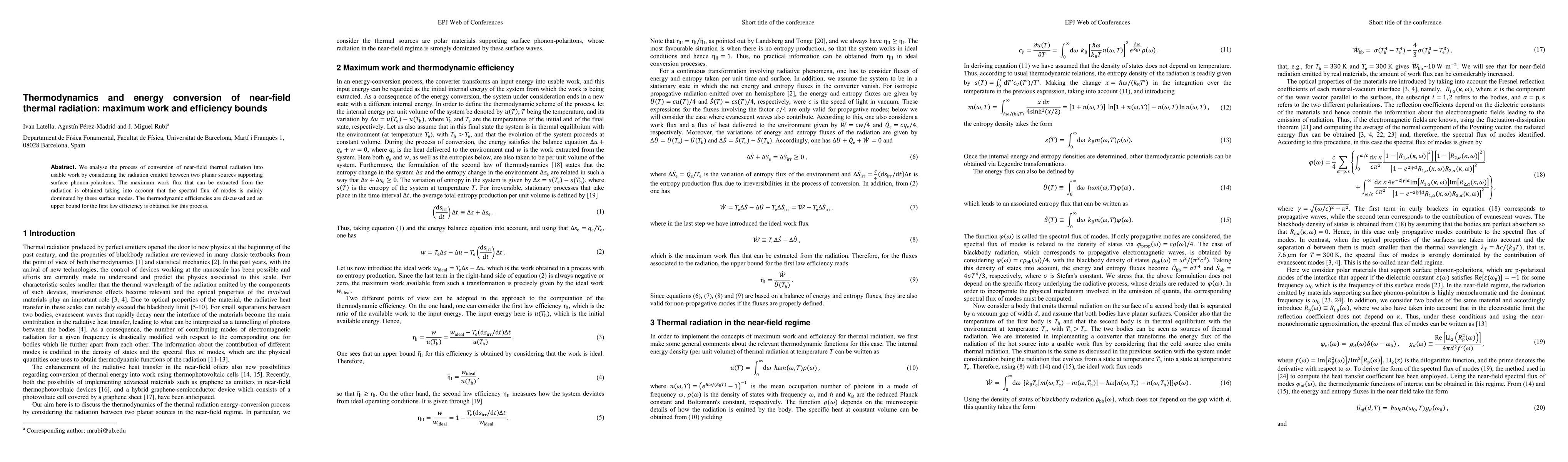 This paper investigates the conversion of near-field thermal radiation into usable work, focusing on the radiation between two planar sources supporting surface phonon-polaritons. It establishes the maximum work flux and an upper bound for the first law efficiency in this thermodynamic process.