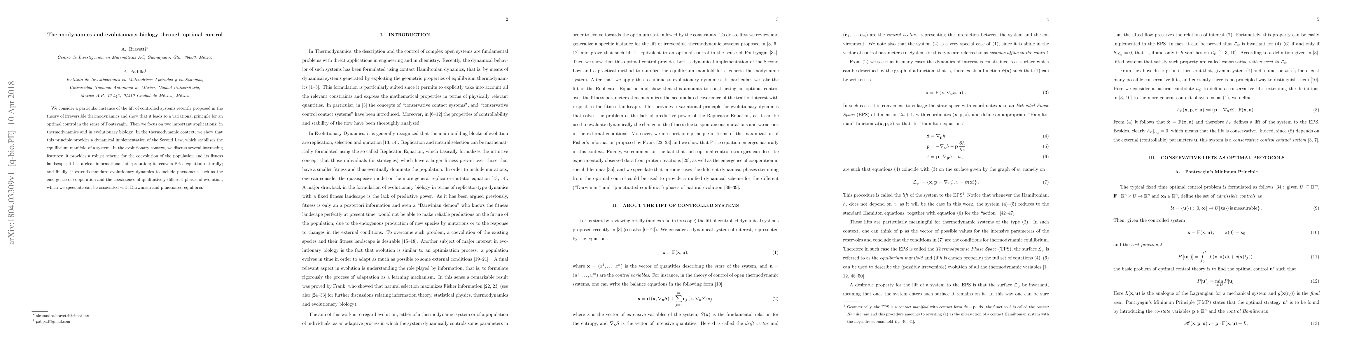 We consider a particular instance of the lift of controlled systems recently proposed in the theory of irreversible thermodynamics and show that it leads to a variational principle for an optimal control in the sense of Pontryagin. Then we focus on two important applications: in thermodynamics and in evolutionary biology. In the thermodynamic context, we show that this principle provides a dynamical implementation of the Second Law, which stabilizes the equilibrium manifold of a system. In the evolutionary context, we discuss several interesting features: it provides a robust scheme for the coevolution of the population and its fitness landscape; it has a clear informational interpretation; it recovers Price equation naturally; and finally, it extends standard evolutionary dynamics to include phenomena such as the emergence of cooperation and the coexistence of qualitatively different phases of evolution, which we speculate can be associated with Darwinism and punctuated equilibria.