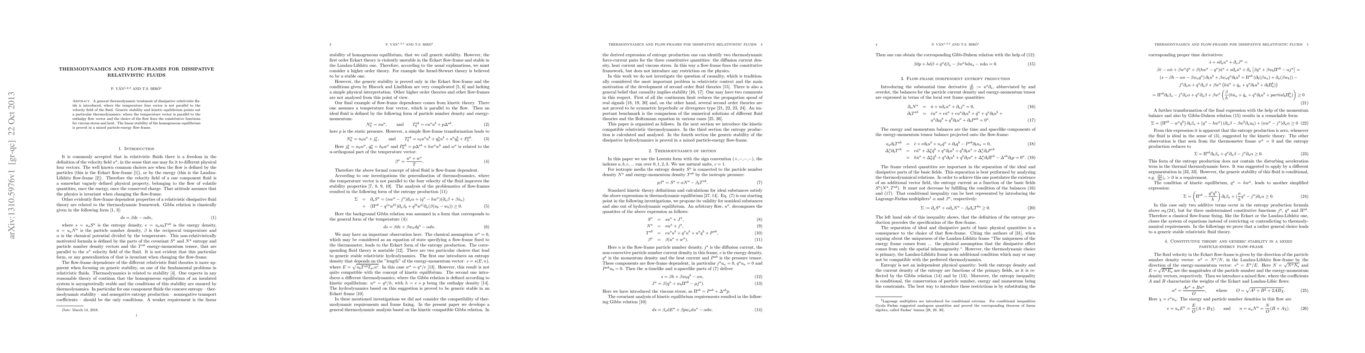 A general thermodynamic treatment of dissipative relativistic fluids is introduced, where the temperature four vector is not parallel to the velocity field of the fluid. Generic stability and kinetic equilibrium points out a particular thermodynamics, where the temperature vector is parallel to the enthalpy flow vector and the choice of the flow fixes the constitutive functions for viscous stress and heat. The linear stability of the homogeneous equilibrium is proved in a mixed particle-energy flow-frame.