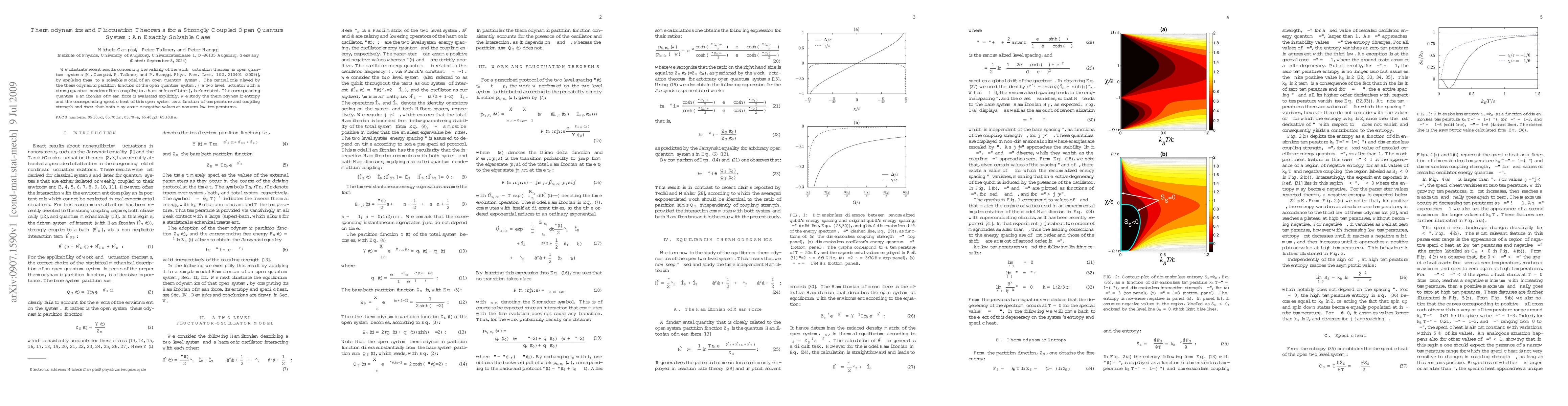 We illustrate recent results concerning the validity of the work fluctuation theorem in open quantum systems [M. Campisi, P. Talkner, and P. H\"{a}nggi, Phys. Rev. Lett. {\bf 102}, 210401 (2009)], by applying them to a solvable model of an open quantum system. The central role played by the thermodynamic partition function of the open quantum system, -- a two level fluctuator with a strong quantum nondemolition coupling to a harmonic oscillator --, is elucidated. The corresponding quantum Hamiltonian of mean force is evaluated explicitly. We study the thermodynamic entropy and the corresponding specific heat of this open system as a function of temperature and coupling strength and show that both may assume negative values at nonzero low temperatures.