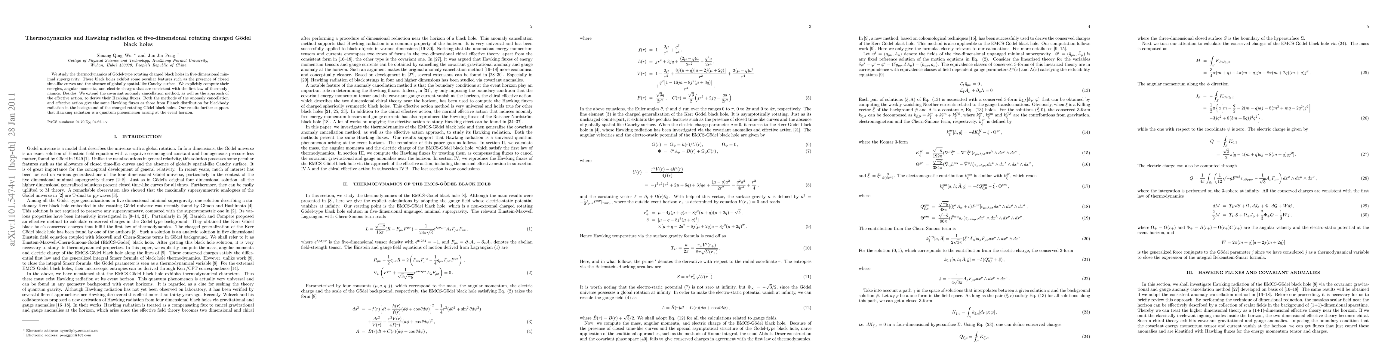 This paper investigates the thermodynamics and Hawking radiation of five-dimensional rotating charged Gödel black holes in minimal supergravity, confirming their energies, angular momenta, and electric charges align with thermodynamic laws. It also demonstrates that Hawking radiation from these black holes follows Planck distribution, supporting the quantum nature of Hawking radiation.