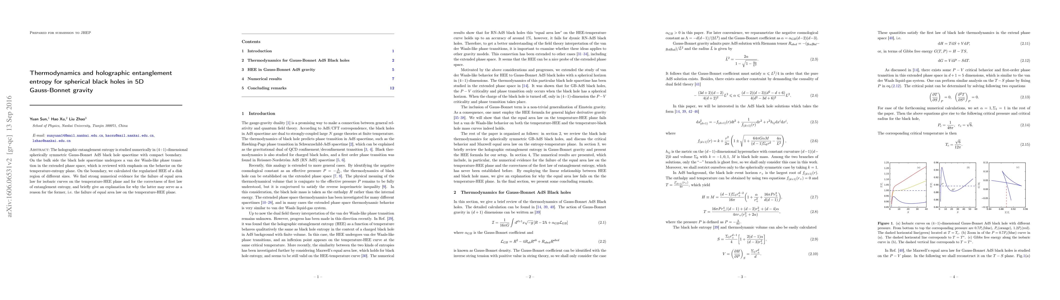 Researchers studied holographic entanglement entropy in a specific type of black hole using 5D Gauss-Bonnet gravity, finding evidence for the failure of the equal area law and support for the first law of entanglement entropy.