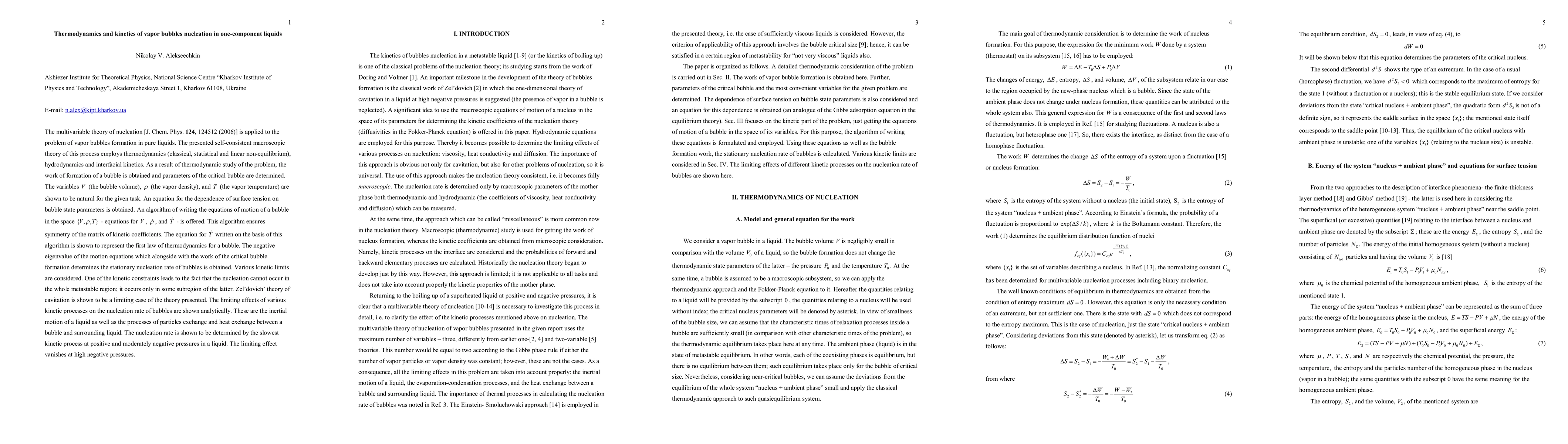 This paper applies a multivariable theory of nucleation to study vapor bubble formation in pure liquids, combining thermodynamics, hydrodynamics, and interfacial kinetics. The authors derive equations for bubble motion and determine the critical bubble parameters, showing that nucleation occurs only in a specific subregion of the metastable region.