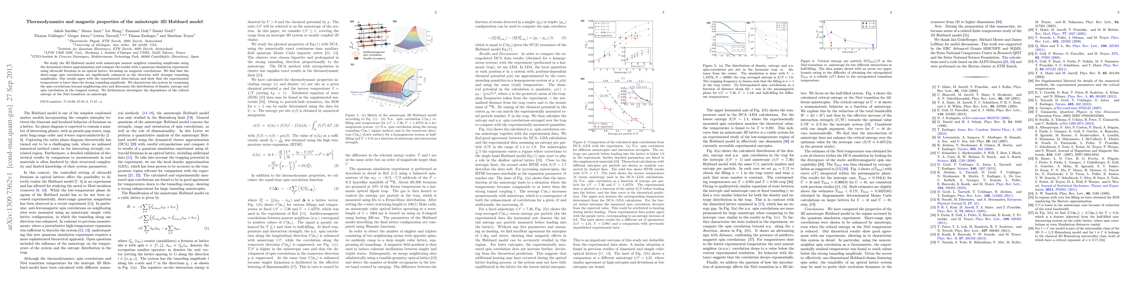 We study the 3D Hubbard model with anisotropic nearest neighbor tunneling amplitudes using the dynamical cluster approximation and compare the results with a quantum simulation experiment using ultracold fermions in an optical lattice, focussing on magnetic correlations. We find that the short-range spin correlations are significantly enhanced in the direction with stronger tunneling amplitudes. Our results agree with the experimental observations and show that the experimental temperature is lower than the strong tunneling amplitude. We characterize the system by examining the spin correlations beyond neighboring sites and determine the distribution of density, entropy and spin correlation in the trapped system. We furthermore investigate the dependence of the critical entropy at the N\'eel transition on anisotropy.