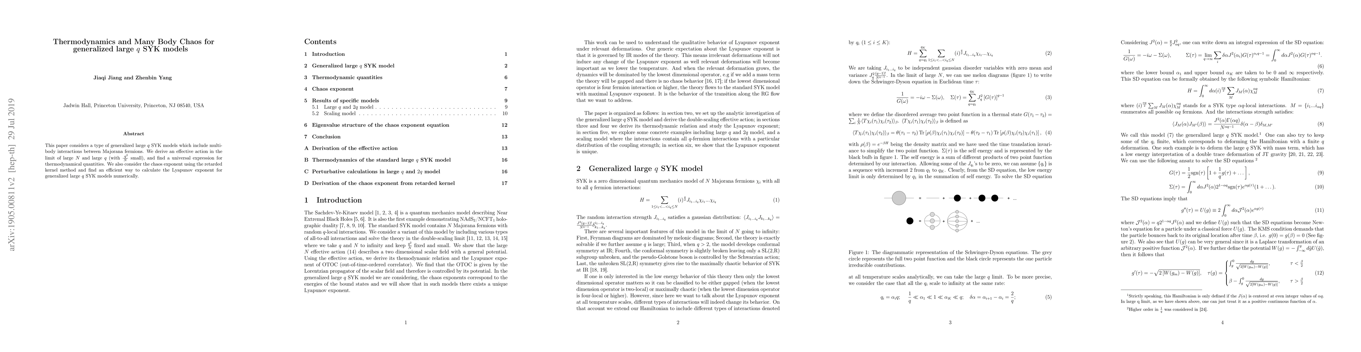 This paper derives an effective action for generalized large $q$ SYK models with multi-body interactions and finds a universal expression for thermodynamic quantities. It also explores chaos exponent and provides a numerical method for calculating the Lyapunov exponent.