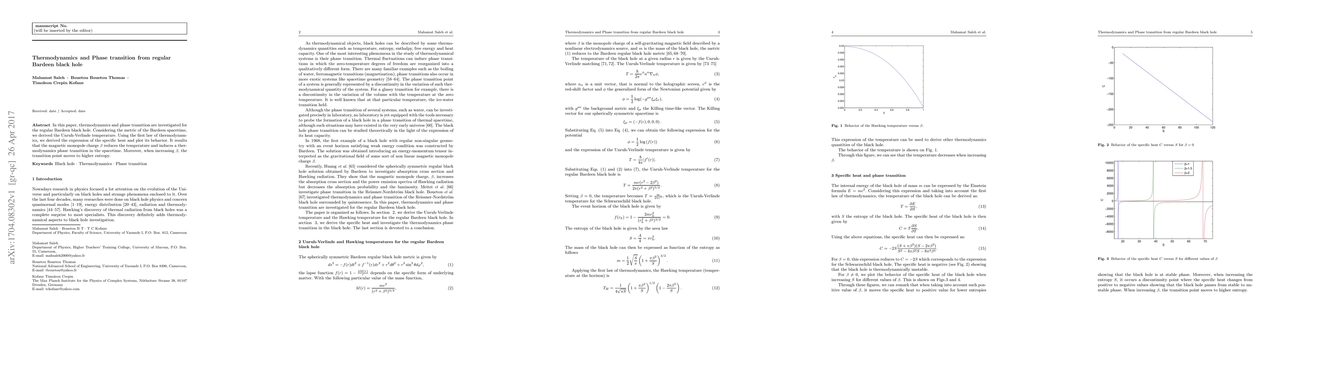 This paper explores the thermodynamics and phase transitions of a regular Bardeen black hole, deriving the Unruh-Verlinde temperature and specific heat. It finds that increasing the magnetic monopole charge β lowers temperature and induces a phase transition, with the transition point shifting to higher entropy as β increases.