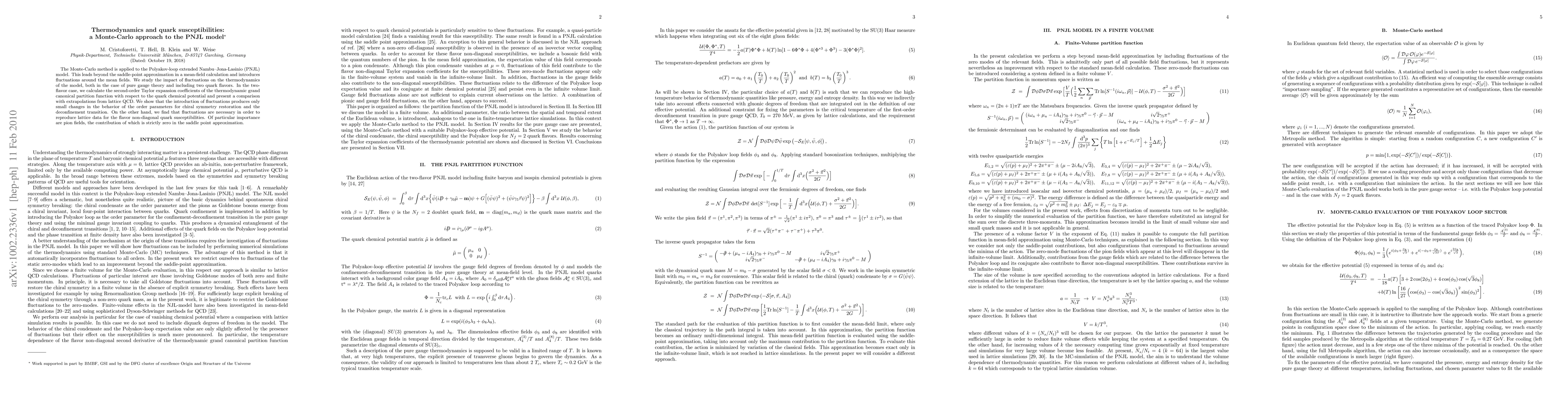 This paper uses Monte-Carlo simulations to analyze the Polyakov-loop extended Nambu--Jona-Lasinio (PNJL) model, showing that fluctuations introduce minor changes in order parameters but are crucial for matching lattice data on quark susceptibilities, especially for pion fields.