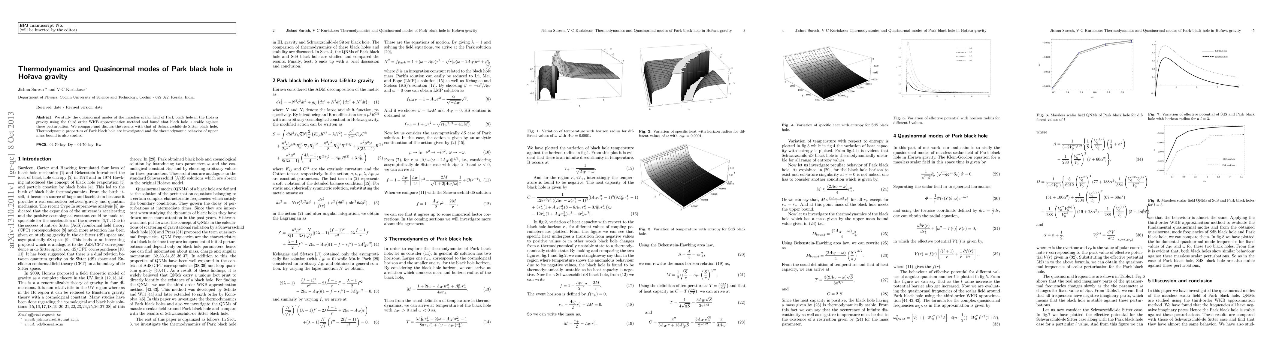 This research examines the quasinormal modes of a Park black hole in Hořava gravity, concluding the black hole's stability against scalar perturbations using a third-order WKB approximation. It also investigates the thermodynamic properties, including the upper mass bound behavior, of the Park black hole.