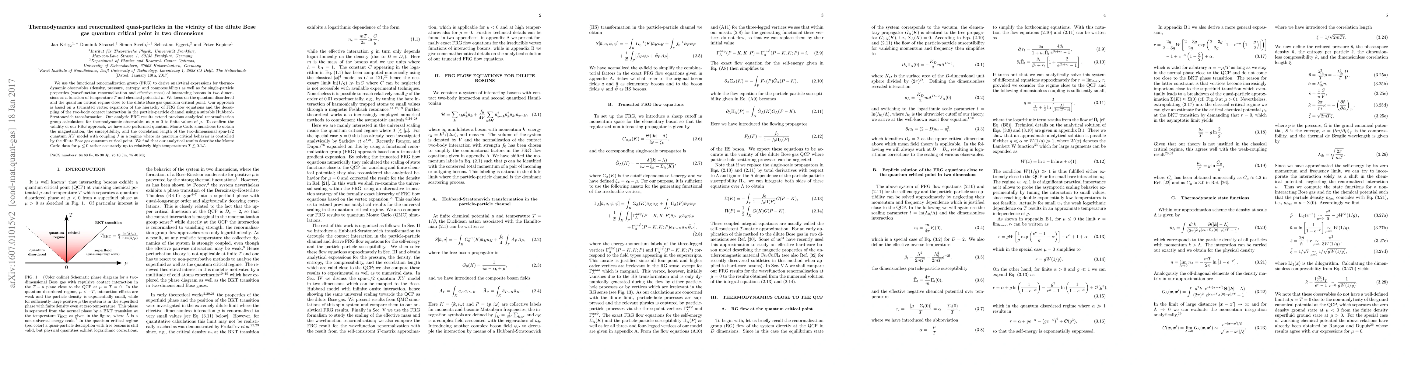 This paper employs the functional renormalization group to derive analytical expressions for thermodynamic and single-particle properties of interacting bosons in two dimensions near the dilute Bose gas quantum critical point. The study extends previous analytical results to finite chemical potentials and validates the approach with quantum Monte Carlo simulations.