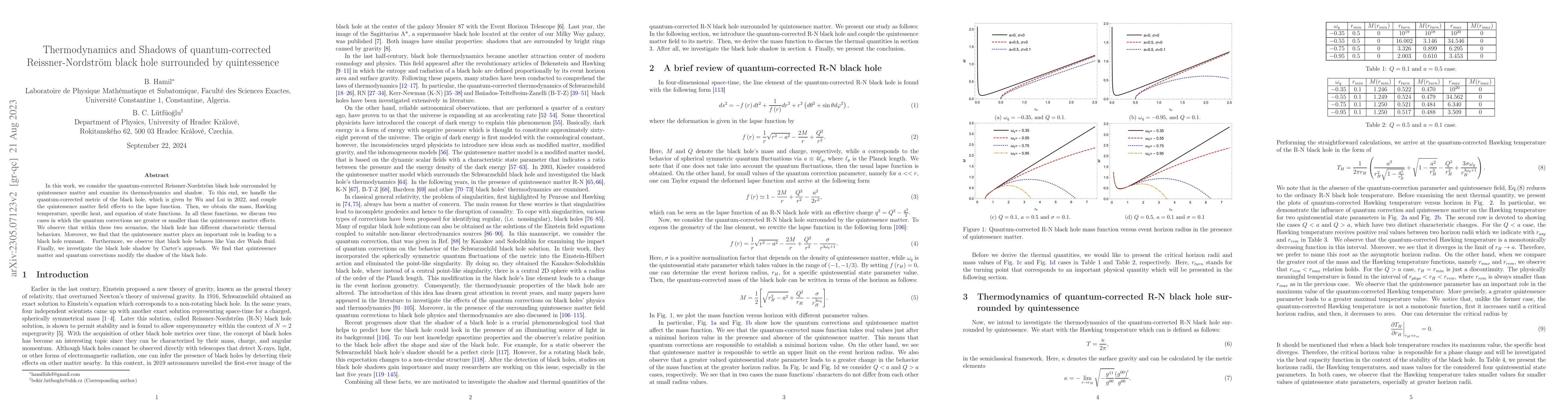 In this work, we consider the quantum-corrected Reissner-Nordstr\"om black hole surrounded by quintessence matter and examine its thermodynamics and shadow. To this end, we handle the quantum-corrected metric of the black hole, which is given by Wu and Lui in 2022, and couple the quintessence matter field effects to the lapse function. Then, we obtain the mass, Hawking temperature, specific heat, and equation of state functions. In all these functions, we discuss two cases in which the quantum corrections are greater or smaller than the quintessence matter effects. We observe that within these two scenarios, the black hole has different characteristic thermal behaviors. Moreover, we find that the quintessence matter plays an important role in leading to a black hole remnant. Finally, we investigate the black hole shadow by Carter's approach. We find that quintessence matter and quantum corrections modify the shadow of the black hole.