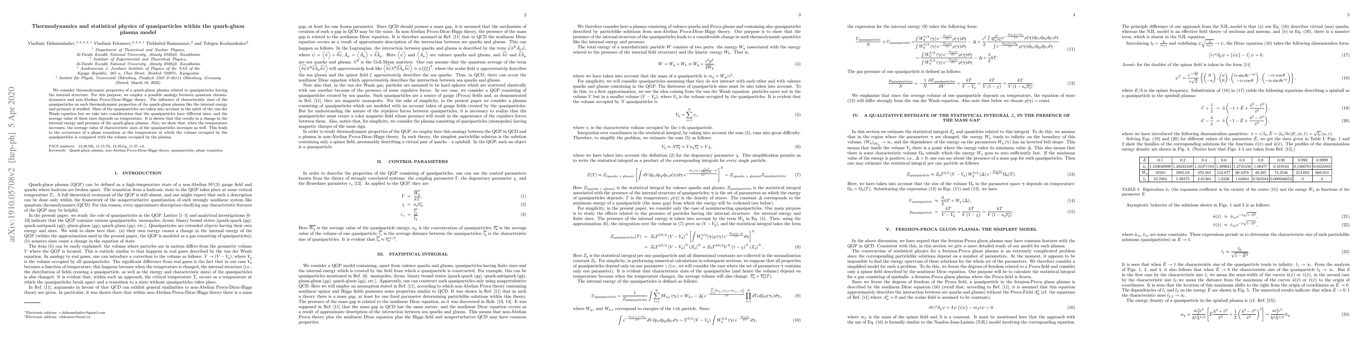 This paper explores the thermodynamics and statistical physics of quasiparticles within the quark-gluon plasma model, using an analogy with non-Abelian Proca-Dirac-Higgs theory. It finds that quasiparticles' size variations, analogous to van der Waals considerations, affect the plasma's internal energy and pressure, leading to a phase transition when the average quasiparticle size matches the plasma volume.