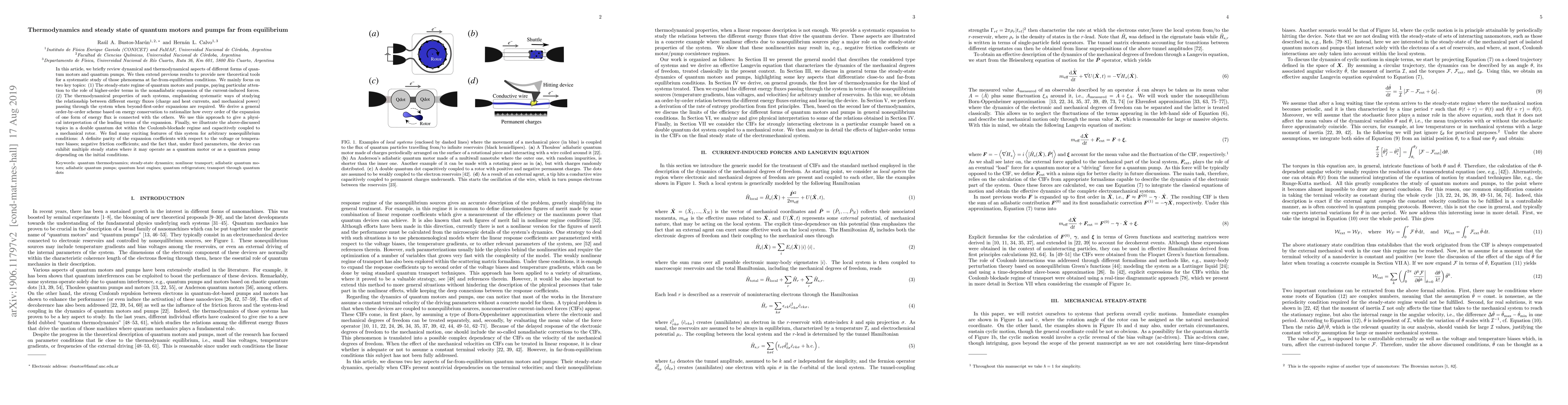 In this article, we briefly review dynamical and thermodynamical aspects of different forms of quantum motors and quantum pumps. We then extend previous results to provide new theoretical tools for a systematic study of those phenomena at far-from-equilibrium conditions. We mainly focus on two key topics: (1) The steady-state regime of quantum motors and pumps, paying particular attention to the role of higher-order terms in the nonadiabatic expansion of the current-induced forces. (2) The thermodynamical properties of such systems, emphasizing systematic ways of studying the relationship between different energy fluxes (charge and heat currents, and mechanical power) passing through the system when beyond-first-order expansions are required. We derive a general order-by-order scheme based on energy conservation to rationalize how every order of the expansion of one form of energy flux is connected with the others. We use this approach to give a physical interpretation of the leading terms of the expansion. Finally, we illustrate the above-discussed topics in a double quantum dot within the Coulomb-blockade regime and capacitively coupled to a mechanical rotor. We find many exciting features of this system for arbitrary nonequilibrium conditions: A definite parity of the expansion coefficients with respect to the voltage or temperature biases; negative friction coefficients; and the fact that, under fixed parameters, the device can exhibit multiple steady states where it may operate as a quantum motor or as a quantum pump depending on the initial conditions.
