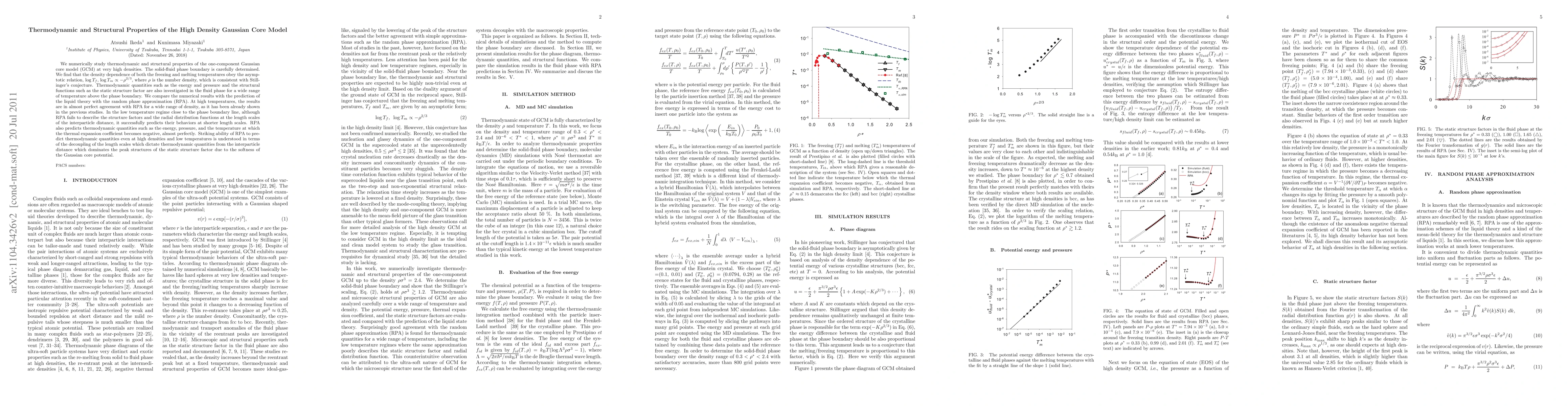 We numerically study thermodynamic and structural properties of the one-component Gaussian core model (GCM) at very high densities. The solid-fluid phase boundary is carefully determined. We find that the density dependence of both the freezing and melting temperatures obey the asymptotic relation, $\log T_f$, $\log T_m \propto -\rho^{2/3}$, where $\rho$ is the number density, which is consistent with Stillinger's conjecture. Thermodynamic quantities such as the energy and pressure and the structural functions such as the static structure factor are also investigated in the fluid phase for a wide range of temperature above the phase boundary. We compare the numerical results with the prediction of the liquid theory with the random phase approximation (RPA). At high temperatures, the results are in almost perfect agreement with RPA for a wide range of density, as it has been already shown in the previous studies. In the low temperature regime close to the phase boundary line, although RPA fails to describe the structure factors and the radial distribution functions at the length scales of the interparticle distance, it successfully predicts their behaviors at shorter length scales. RPA also predicts thermodynamic quantities such as the energy, pressure, and the temperature at which the thermal expansion coefficient becomes negative, almost perfectly. Striking ability of RPA to predict thermodynamic quantities even at high densities and low temperatures is understood in terms of the decoupling of the length scales which dictate thermodynamic quantities from the interparticle distance which dominates the peak structures of the static structure factor due to the softness of the Gaussian core potential.