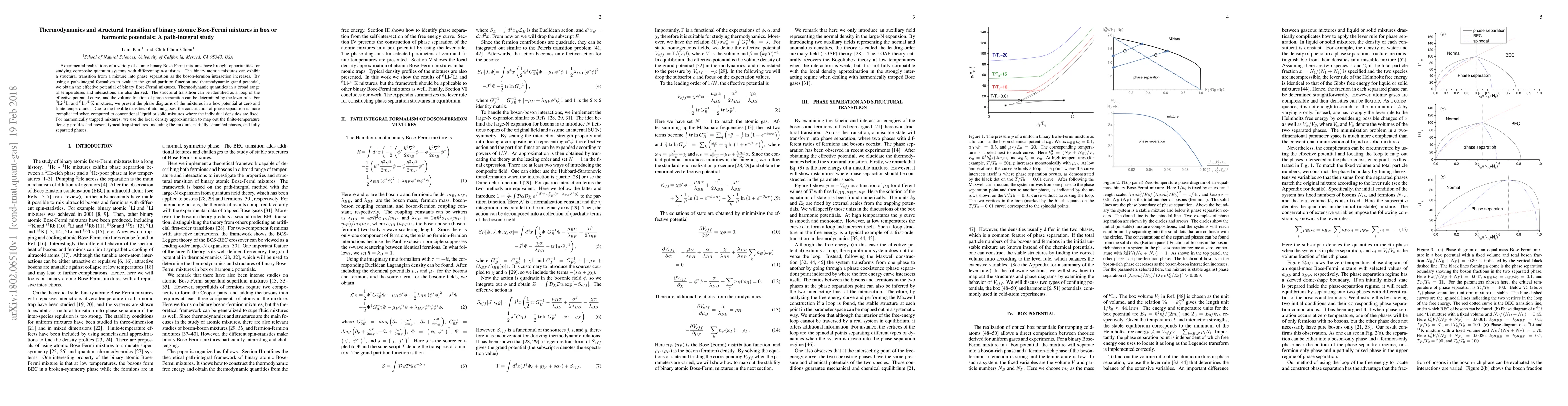 This paper investigates the thermodynamics and structural transitions in binary atomic Bose-Fermi mixtures using path-integral methods. It derives phase diagrams for $^6$Li-$^7$Li and $^6$Li-$^{41}$K mixtures, showing phase separation under varying interactions and temperatures, and explores density profiles in harmonically trapped systems.