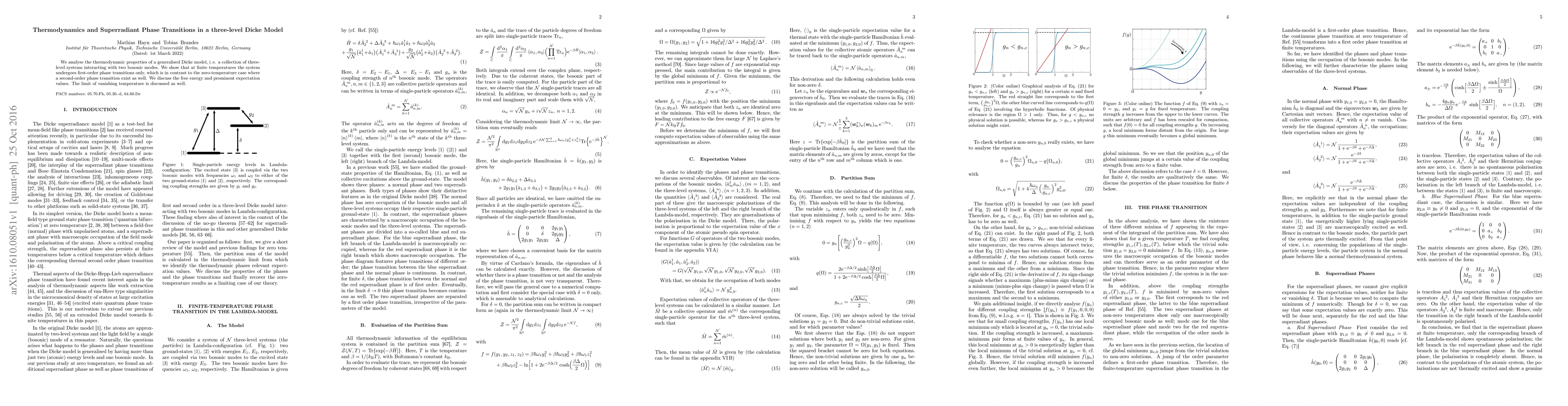 We analyse the thermodynamic properties of a generalised Dicke model, i.e. a collection of three-level systems interacting with two bosonic modes. We show that at finite temperatures the system undergoes first-order phase transitions only, which is in contrast to the zero-temperature case where a second-order phase transition exist as well. We discuss the free energy and prominent expectation values. The limit of vanishing temperature is discussed as well.