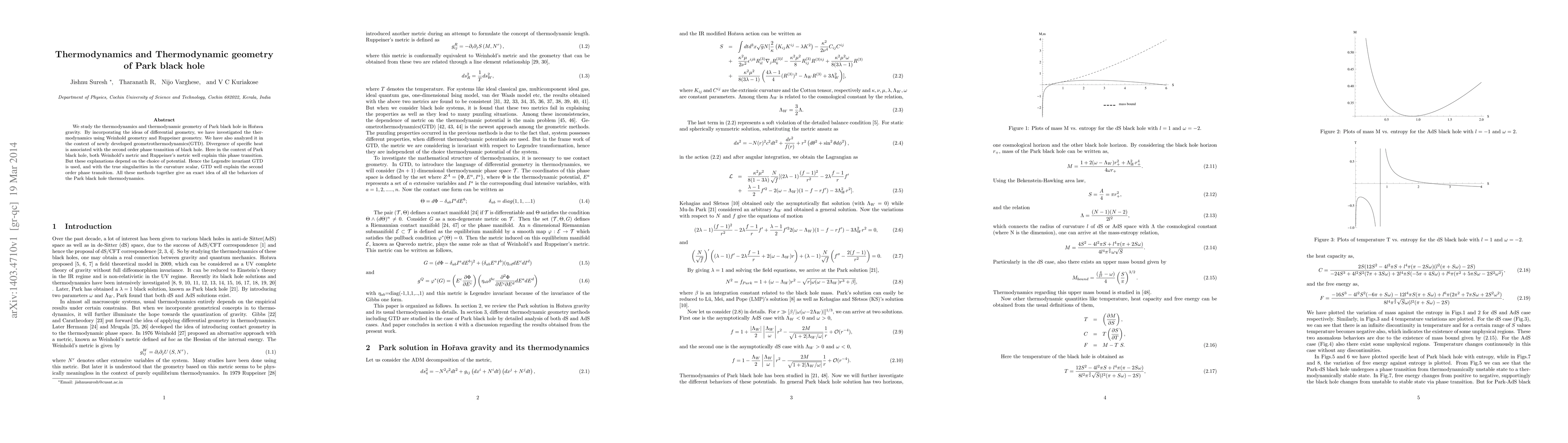 We study the thermodynamics and thermodynamic geometry of Park black hole in Ho\v{r}ava gravity. By incorporating the ideas of differential geometry, we have investigated the thermodynamics using Weinhold geometry and Ruppeiner geometry. We have also analyzed it in the context of newly developed geometrothermodynamics(GTD). Divergence of specific heat is associated with the second order phase transition of black hole. Here in the context of Park black hole, both Weinhold's metric and Ruppeiner's metric well explain this phase transition. But these explanations depend on the choice of potential. Hence the Legendre invariant GTD is used, and with the true singularities in the curvature scalar, GTD well explain the second order phase transition. All these methods together give an exact idea of all the behaviors of the Park black hole thermodynamics.