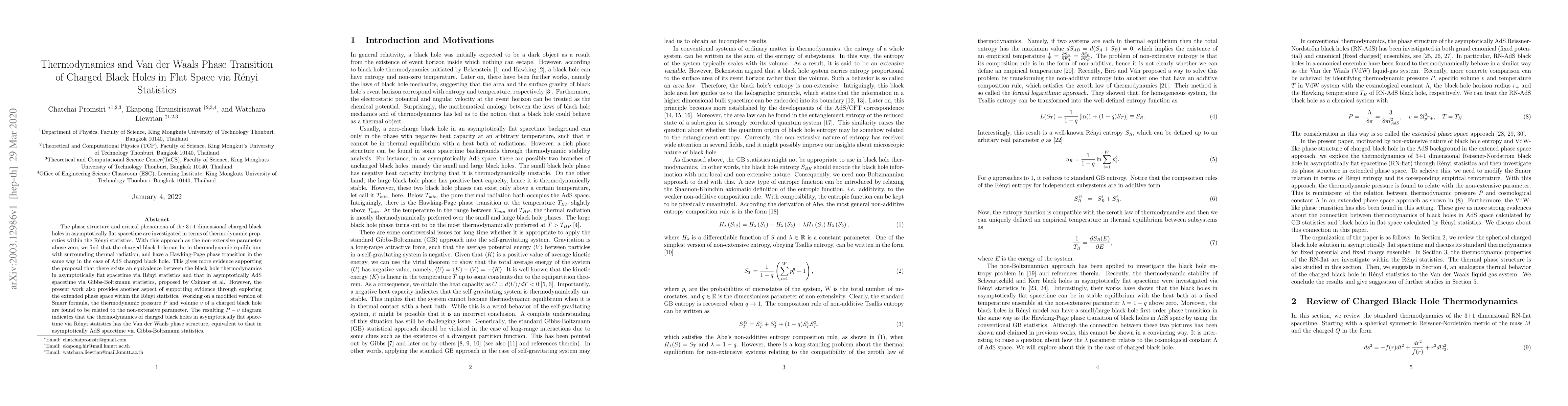 This paper investigates the thermodynamics and phase transitions of charged black holes in flat space using R\'enyi statistics, revealing a Hawking-Page phase transition and a Van der Waals-like phase structure, supporting the equivalence between thermodynamics in flat and AdS spacetimes. The R\'enyi statistics introduces a non-extensive parameter, linking thermodynamic pressure and volume to this parameter.
