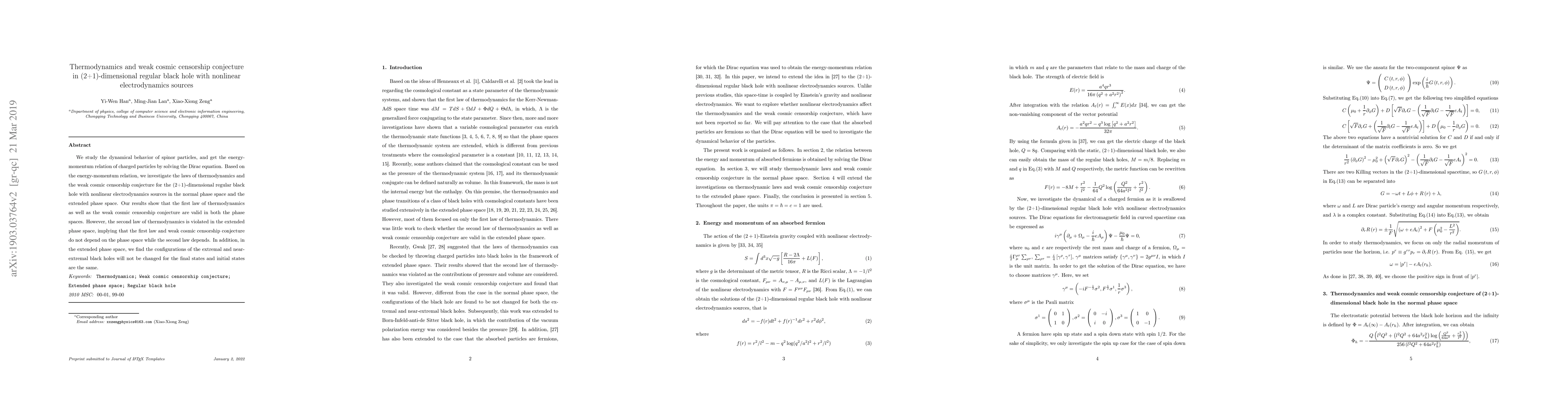 We study the dynamical behavior of spinor particles, and get the energy-momentum relation of charged particles by solving the Dirac equation. Based on the energy-momentum relation, we investigate the laws of thermodynamics and the weak cosmic censorship conjecture for the (2+1)-dimensional regular black hole with nonlinear electrodynamics sources in the normal phase space and the extended phase space. Our results show that the first law of thermodynamics as well as the weak cosmic censorship conjecture are valid in both the phase spaces. However, the second law of thermodynamics is violated in the extended phase space, implying that the first law and weak cosmic censorship conjecture do not depend on the phase space while the second law depends. In addition, in the extended phase space, we find the configurations of the extremal and near-extremal black holes will not be changed for the final states and initial states are the same.