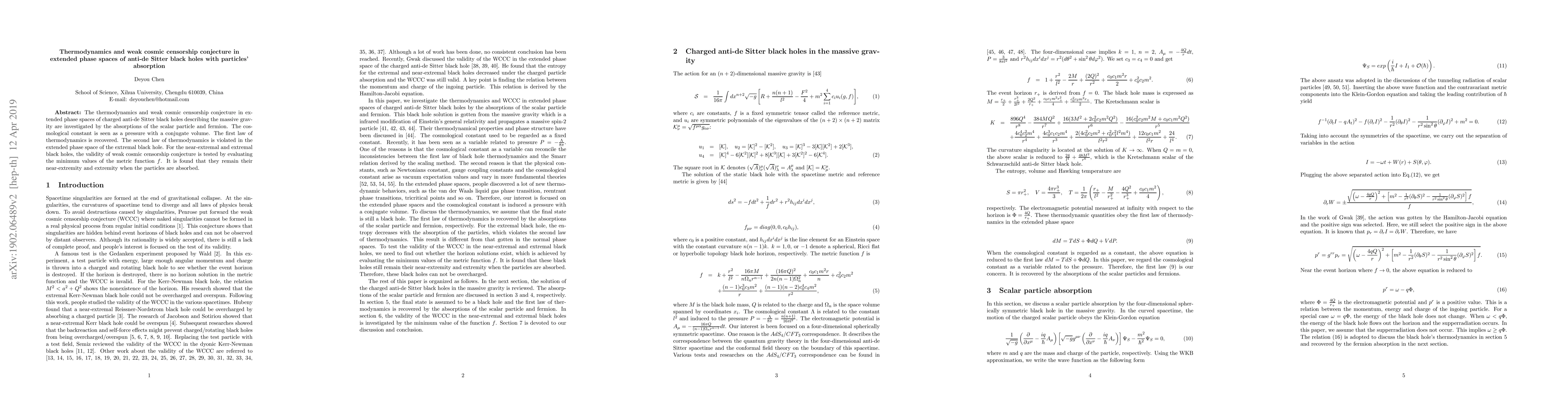 The thermodynamics and weak cosmic censorship conjecture in extended phase spaces of charged anti-de Sitter black holes describing the massive gravity are investigated by the absorptions of the scalar particle and fermion. The cosmological constant is seen as a pressure with a conjugate volume. The first law of thermodynamics is recovered. The second law of thermodynamics is violated in the extended phase space of the extremal black hole. For the near-extremal and extremal black holes, the validity of weak cosmic censorship conjecture is tested by evaluating the minimum values of the metric function $f$. It is found that they remain their near-extremity and extremity when the particles are absorbed.