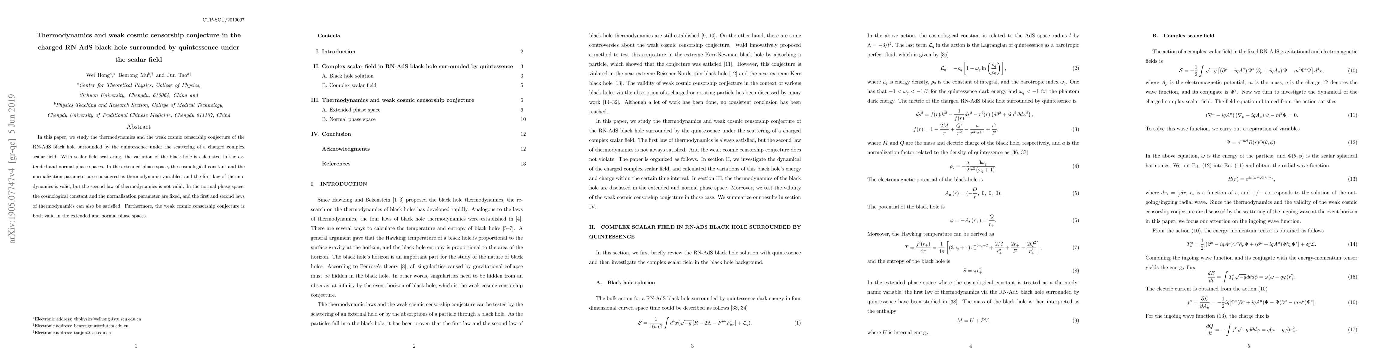 In this paper, we study the thermodynamics and the weak cosmic censorship conjecture of the RN-AdS black hole surrounded by the quintessence under the scattering of a charged complex scalar field. With scalar field scattering, the variation of the black hole is calculated in the extended and normal phase spaces. In the extended phase space, the cosmological constant and the normalization parameter are considered as thermodynamic variables, and the first law of thermodynamics is valid, but the second law of thermodynamics is not valid. In the normal phase space, the cosmological constant and the normalization parameter are fixed, and the first and second laws of thermodynamics can also be satisfied. Furthermore, the weak cosmic censorship conjecture is both valid in the extended and normal phase spaces.