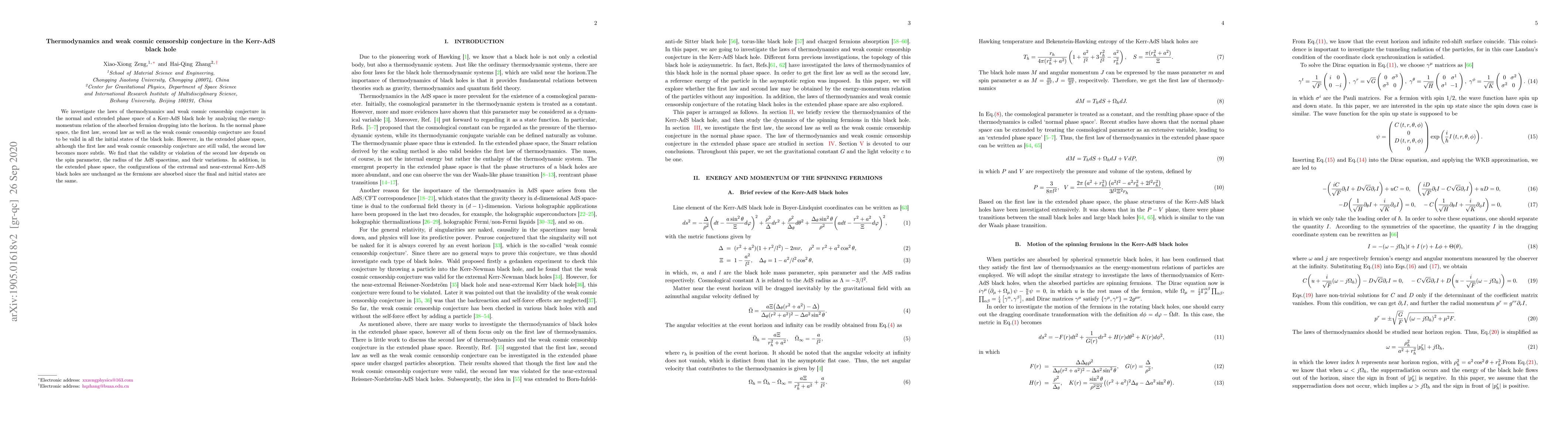 This research examines thermodynamics and the weak cosmic censorship conjecture in Kerr-AdS black holes. In the normal phase space, all thermodynamic laws and the conjecture hold, but in the extended phase space, the second law's validity is nuanced and depends on the black hole's spin and AdS radius.