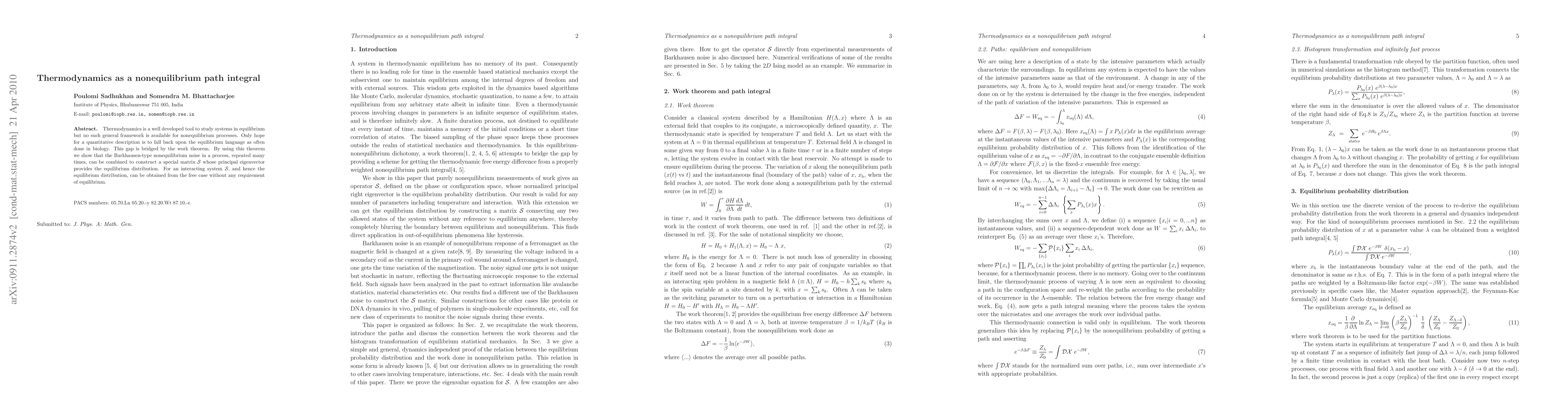 Thermodynamics is a well developed tool to study systems in equilibrium but no such general framework is available for non-equilibrium processes. Only hope for a quantitative description is to fall back upon the equilibrium language as often done in biology. This gap is bridged by the work theorem. By using this theorem we show that the Barkhausen-type non-equilibrium noise in a process, repeated many times, can be combined to construct a special matrix ${\cal S}$ whose principal eigenvector provides the equilibrium distribution. For an interacting system ${\cal S}$, and hence the equilibrium distribution, can be obtained from the free case without any requirement of equilibrium.