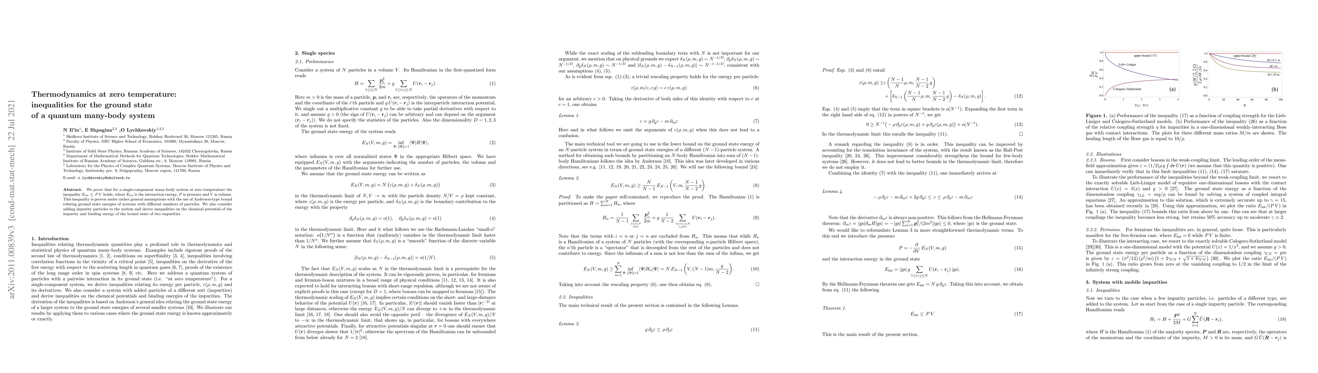This research proves that for a quantum many-body system at absolute zero, the energy of the ground state ($E_{int}$) is less than or equal to the product of pressure (P) and volume (V). The proof uses general assumptions and an Anderson-type bound comparing ground state energies of systems with varying particle numbers. The study also explores the effects of adding impurity particles, deriving inequalities for their chemical potential and the binding energy of two impurity particles.