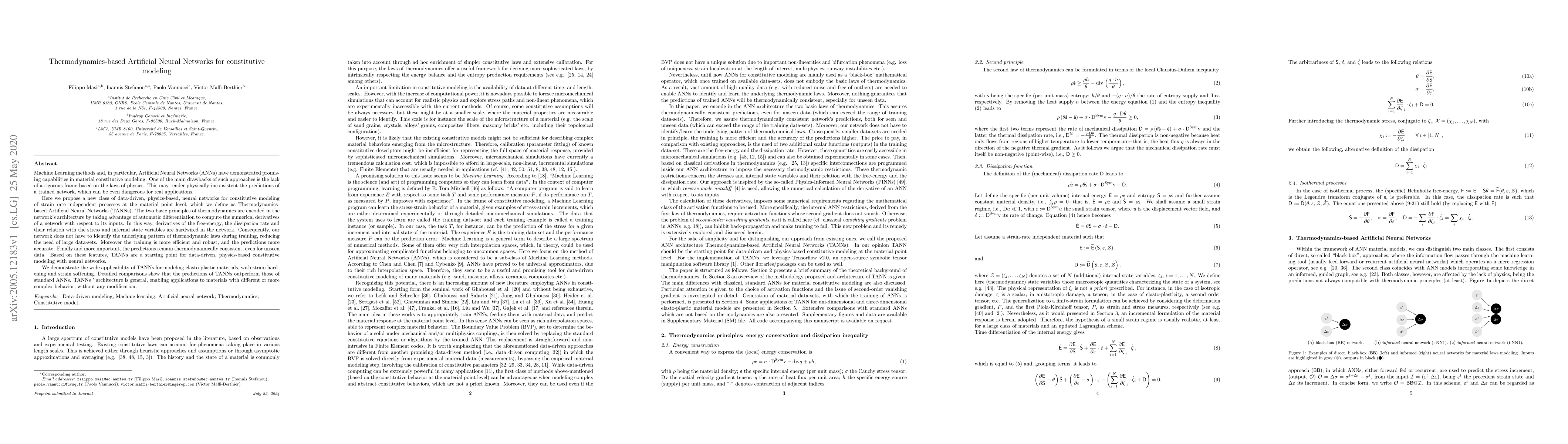 This paper introduces Thermodynamics-based Artificial Neural Networks (TANNs) for constitutive modeling, embedding principles of thermodynamics directly into the network architecture to ensure physically consistent predictions. TANNs outperform standard ANNs in modeling elasto-plastic materials, demonstrating robustness, efficiency, and thermodynamic consistency.