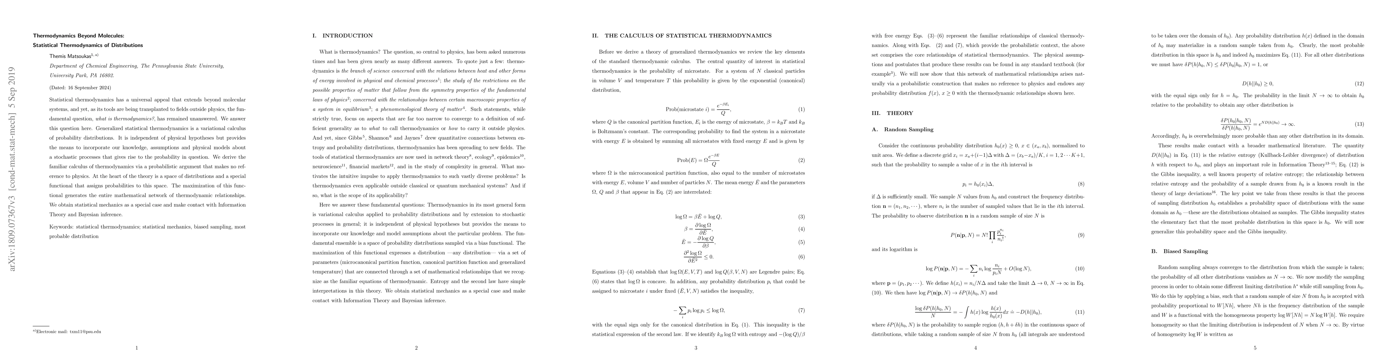 Statistical thermodynamics has a universal appeal that extends beyond molecular systems, and yet, as its tools are being transplanted to fields outside physics, the fundamental question, \textit{what is thermodynamics?}, has remained unanswered. We answer this question here. Generalized statistical thermodynamics is a variational calculus of probability distributions. It is independent of physical hypotheses but provides the means to incorporate our knowledge, assumptions and physical models about a stochastic processes that gives rise to the probability in question. We derive the familiar calculus of thermodynamics via a probabilistic argument that makes no reference to physics. At the heart of the theory is a space of distributions and a special functional that assigns probabilities to this space. The maximization of this functional generates the entire mathematical network of thermodynamic relationships. We obtain statistical mechanics as a special case and make contact with Information Theory and Bayesian inference.