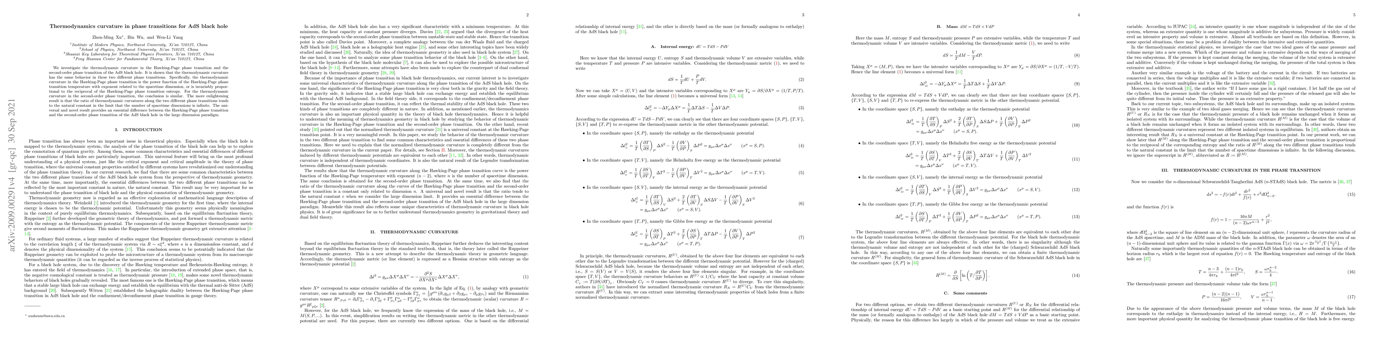 This paper explores the thermodynamic curvature in both the Hawking-Page and second-order phase transitions of AdS black holes, revealing similar behaviors in their curvatures. It concludes that the ratio of these curvatures approaches a natural constant in the infinite-dimensional limit, highlighting a fundamental distinction in these transitions.