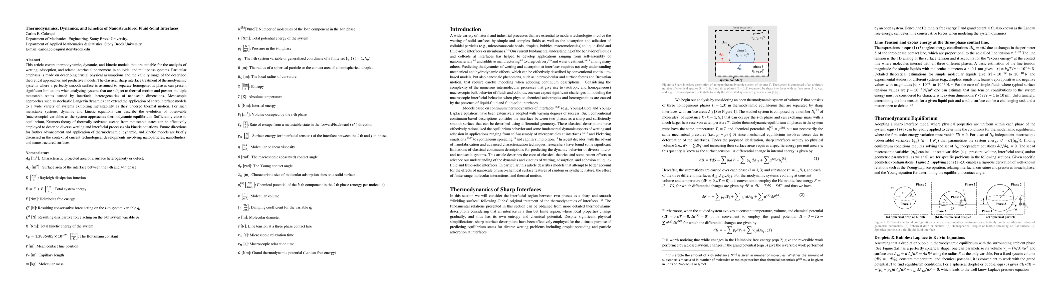 This article covers thermodynamic, dynamic, and kinetic models that are suitable for the analysis of wetting, adsorption, and related interfacial phenomena in colloidal and multiphase systems. Particular emphasis is made on describing crucial physical assumptions and the validity range of the described theoretical approaches and predictive models. The classical sharp interface treatment of thermodynamic systems where a perfectly smooth surface is assumed to separate homogeneous phases can present significant limitations when analyzing systems that are subject to thermal motion and present multiple metastable states caused by interfacial heterogeneities of nanoscale dimensions. Mesoscopic approaches such as stochastic Langevin dynamics can extend the application of sharp interface models to a wide variety of systems exhibiting metastability as they undergo thermal motion. For such metastable systems, dynamic and kinetic equations can describe the evolution of observable (macroscopic) variables as the system approaches thermodynamic equilibrium. Sufficiently close to equilibrium, Kramers theory of thermally activated escape from metastable states can be effectively employed to describe diverse wetting and interfacial processes via kinetic equations. Future directions for further advancement and application of thermodynamic, dynamic, and kinetic models are briefly discussed in the context of current technological developments involving nanoparticles, nanofluidics, and nanostructured surfaces.