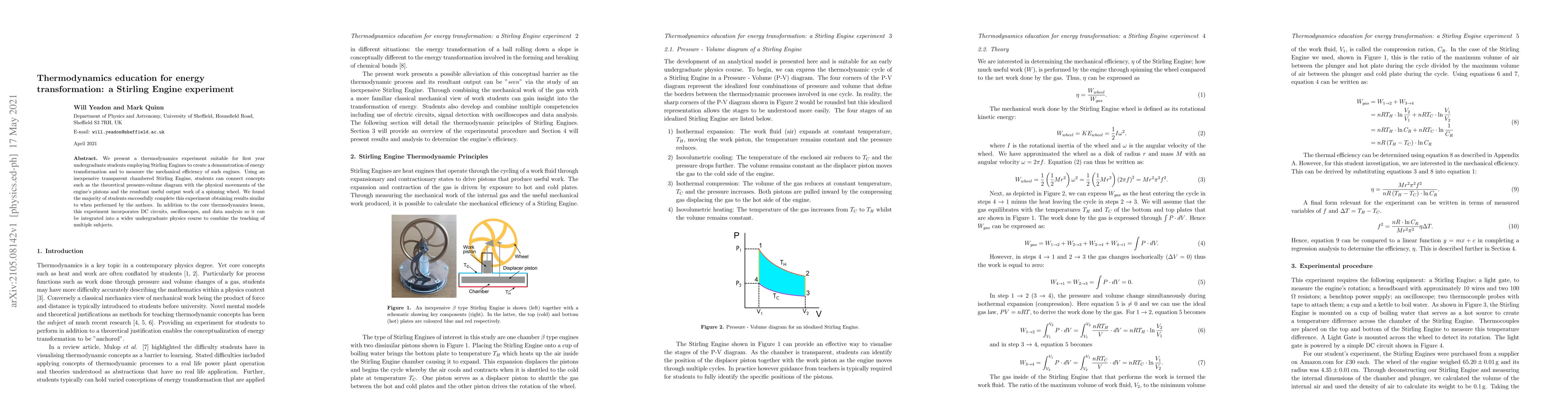 We present a thermodynamics experiment suitable for first year undergraduate students employing Stirling Engines to create a demonstration of energy transformation and to measure the mechanical efficiency of such engines. Using an inexpensive transparent chambered Stirling Engine, students can connect concepts such as the theoretical pressure-volume diagram with the physical movements of the engine's pistons and the resultant useful output work of a spinning wheel. We found the majority of students successfully complete this experiment obtaining results similar to when performed by the authors. In addition to the core thermodynamics lesson, this experiment incorporates DC circuits, oscilloscopes, and data analysis so it can be integrated into a wider undergraduate physics course to combine the teaching of multiple subjects.