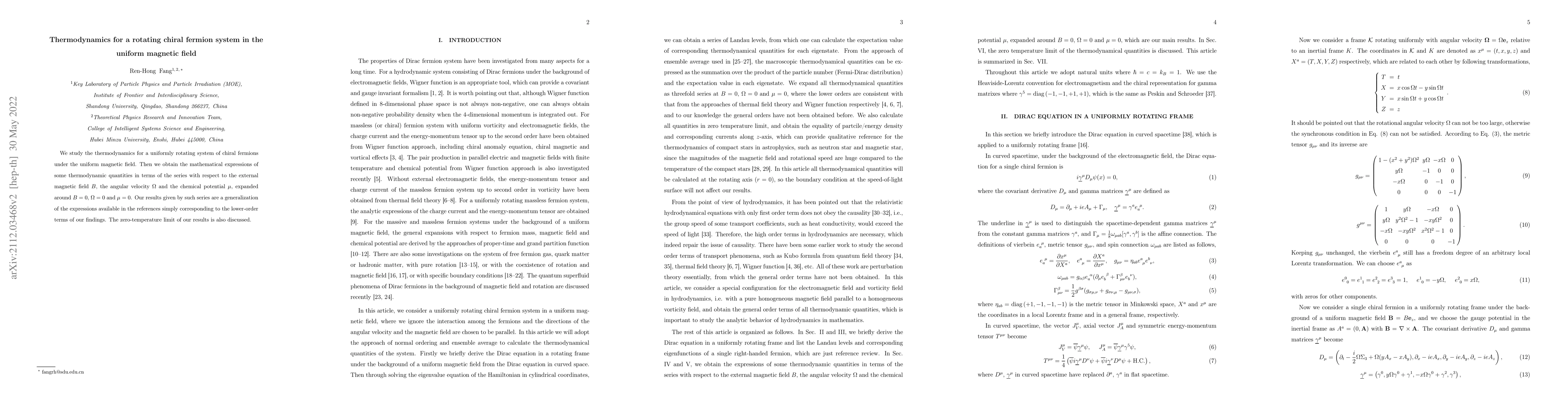 This paper investigates the thermodynamics of a rotating chiral fermion system under a uniform magnetic field, deriving series expansions for thermodynamic quantities in terms of $B$, $\Omega$, and $\mu$. The results generalize existing expressions and include the zero-temperature limit.