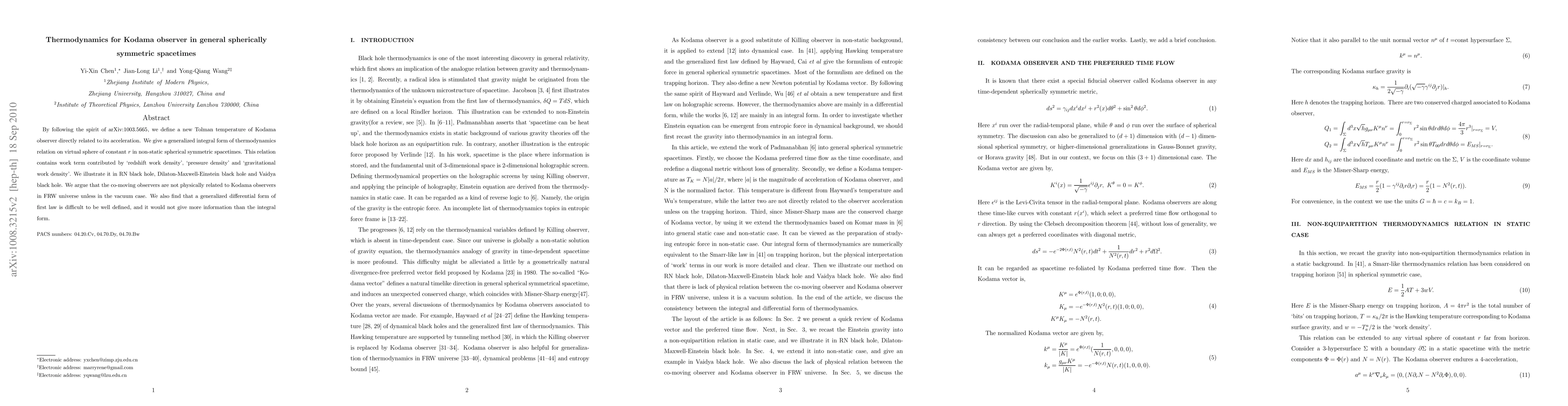 By following the spirit of arXiv:1003.5665, we define a new Tolman temperature of Kodama observer directly related to its acceleration. We give a generalized integral form of thermodynamics relation on virtual sphere of constant $r$ in non-static spherical symmetric spacetimes. This relation contains work term contributed by `redshift work density', `pressure density' and `gravitational work density'. We illustrate it in RN black hole, Dilaton-Maxwell-Einstein black hole and Vaidya black hole. We argue that the co-moving observers are not physically related to Kodama observers in FRW universe unless in the vacuum case. We also find that a generalized differential form of first law is difficult to be well defined, and it would not give more information than the integral form.