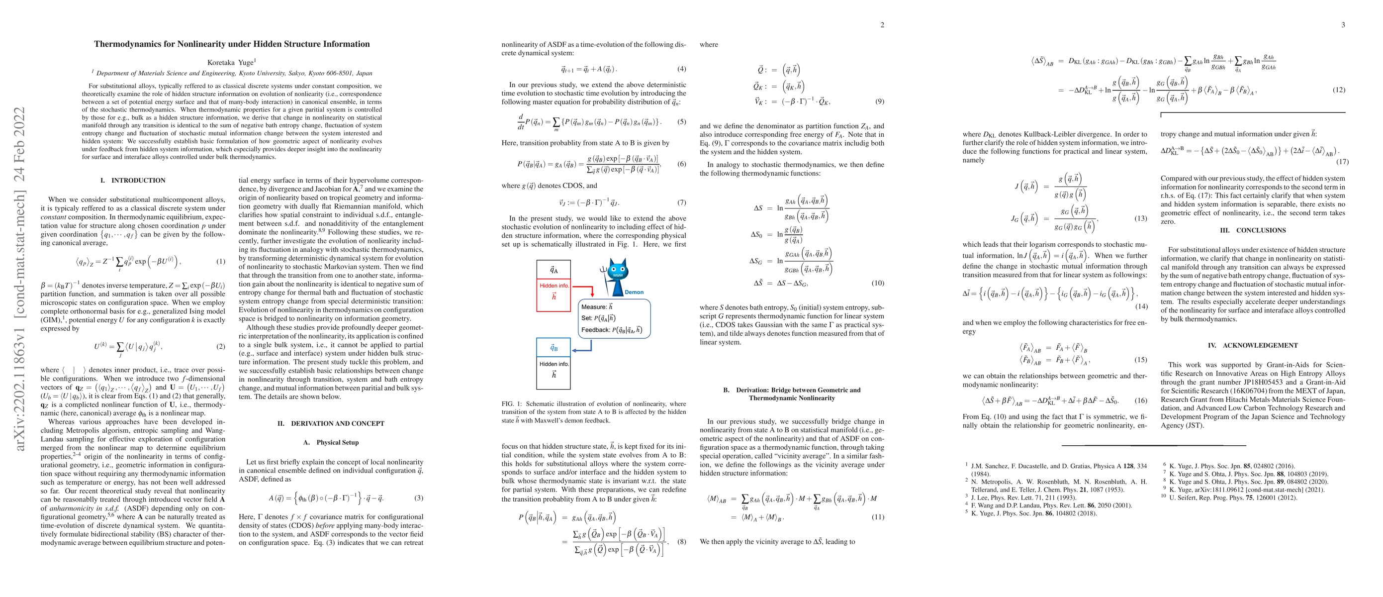 For substitutional alloys, typically refered to as classical discrete systems under constant composition, we theoretically examine the role of hidden structure information on evolution of nonlinearity (i.e., correspondence between a set of potential energy surface and that of many-body interaction) in canonical ensemble, in terms of the stochastic thermodynamics. When thermodynamic properties for a given paritial system is controlled by those for e.g., bulk as a hidden structure information, we derive that change in nonlinearity on statistical manifold through any transition is identical to the sum of negative bath entropy change, fluctuation of system entropy change and fluctuation of stochastic mutual information change between the system interested and hidden system: We successfully establish basic formulation of how geometric aspect of nonlinearity evolves under feedback from hidden system information, which especially provides deeper insight into the nonlinearity for surface and interface alloys controlled under bulk thermodynamics.