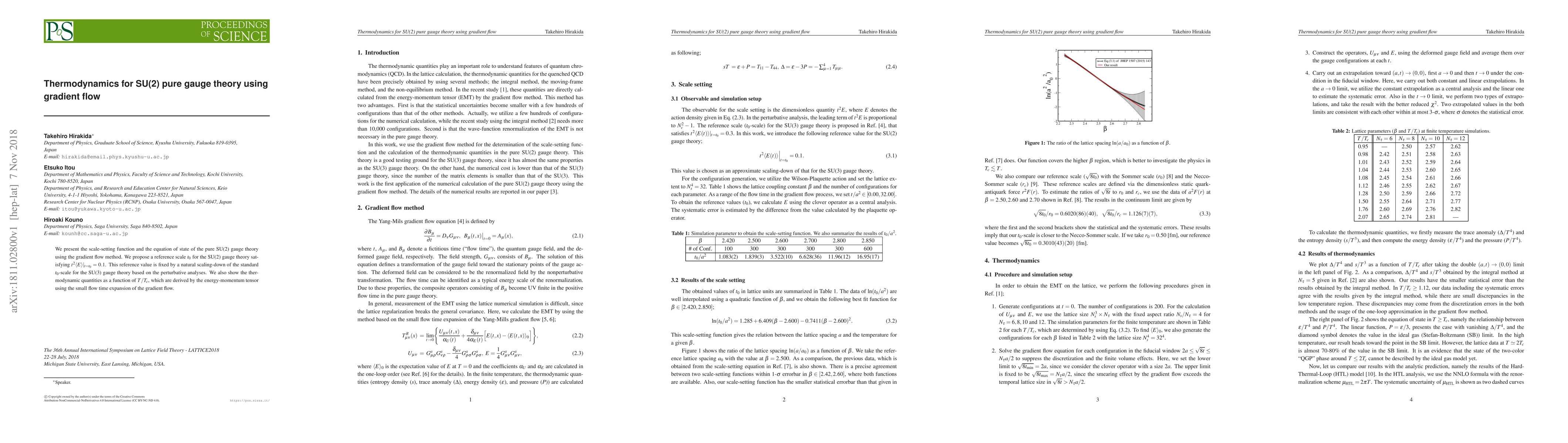 This paper determines the scale-setting function and equation of state for SU(2) pure gauge theory via gradient flow, proposing a reference scale $t_0$ based on perturbative analyses. Thermodynamic quantities are derived from the energy-momentum tensor using gradient flow's small flow time expansion.