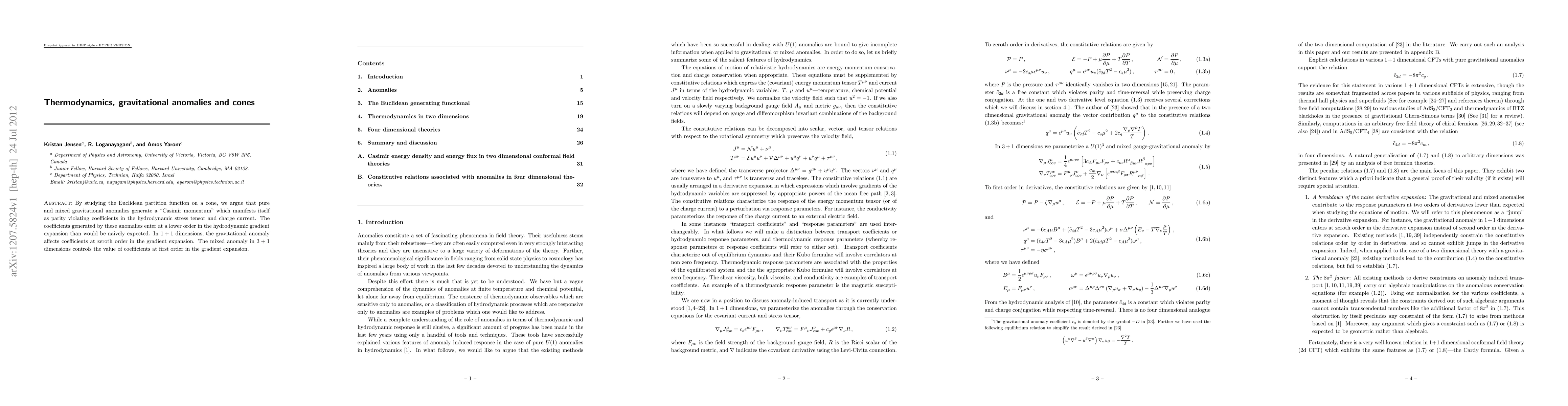 By studying the Euclidean partition function on a cone, we argue that pure and mixed gravitational anomalies generate a "Casimir momentum" which manifests itself as parity violating coefficients in the hydrodynamic stress tensor and charge current. The coefficients generated by these anomalies enter at a lower order in the hydrodynamic gradient expansion than would be naively expected. In 1+1 dimensions, the gravitational anomaly affects coefficients at zeroth order in the gradient expansion. The mixed anomaly in 3+1 dimensions controls the value of coefficients at first order in the gradient expansion.